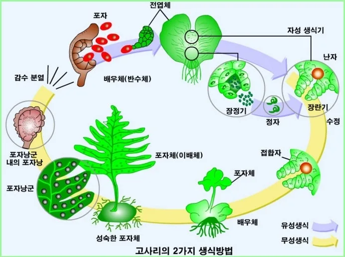 두번째로 양치식물의 경우는 배우체(n)과 포자체(2n)이 따로 세대를 이뤄서 유성생식(배우체생식)과 무성생식(포자체 잎 뒷면)이 둘 다 존재합니다. 배우체인 전엽체가 난세포와 정자를 만들어 어린 식물체(어린 고사리)를 만듭니다. 유성생식을 할 때 선태식물과 마찬가지로 물이 필요합니다.