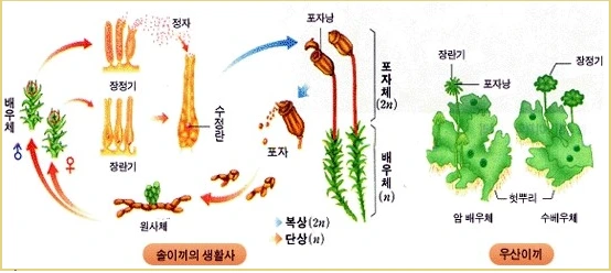 이 선태식물이 세대교번으로 생식을 할 때는 정자의 2개의 편모가 물속을 헤엄쳐 장란기에 들어가 난세포와 수정합니다. 이때, 암배우체(n)위에 포자체(2n)이 기생합니다. 이것은 원시 생식이 기생을 바탕으로하는 공생으로부터 발달되었다는 점과 고등동식물로 올 수록 분화되어 독립된 기관으로 발현되는 과정을 역추적해볼 수 있는 단서라는 점을 흥미로운 점으로 지적해볼 수 있습니다.