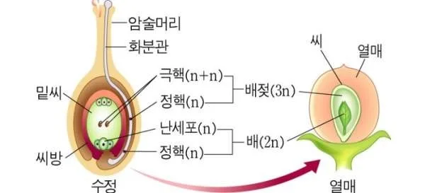 여기서 나자식물의 씨앗맺기는 정핵이 난핵을 찾아가는 데 걸리는 시간 1년 정도라는 것이 함정ㅎㄷㄷㄷ
