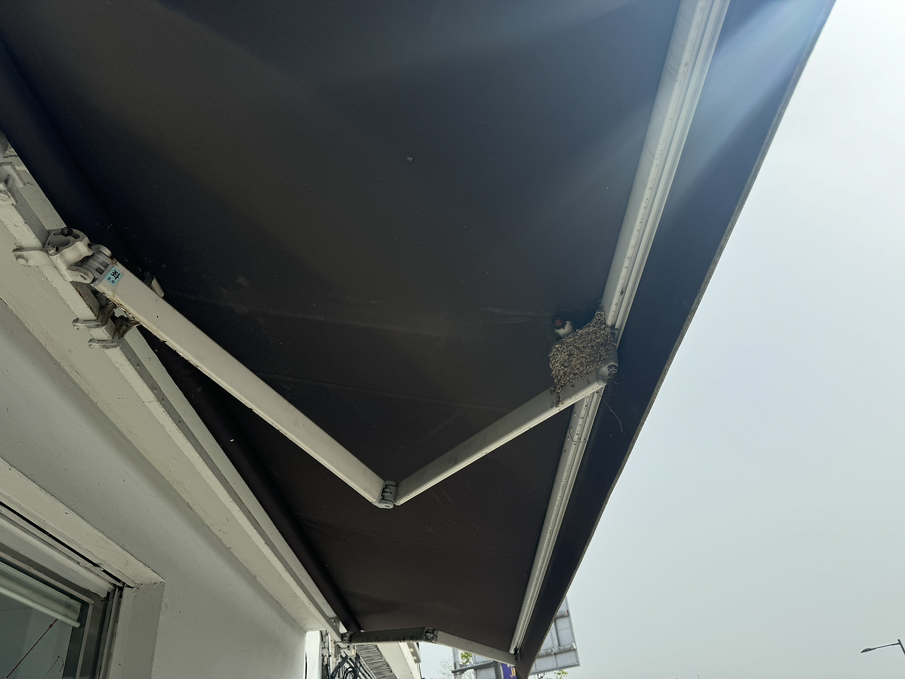 가게 바깥에 쳐 놓은 천막에 제비집을 지었어요.