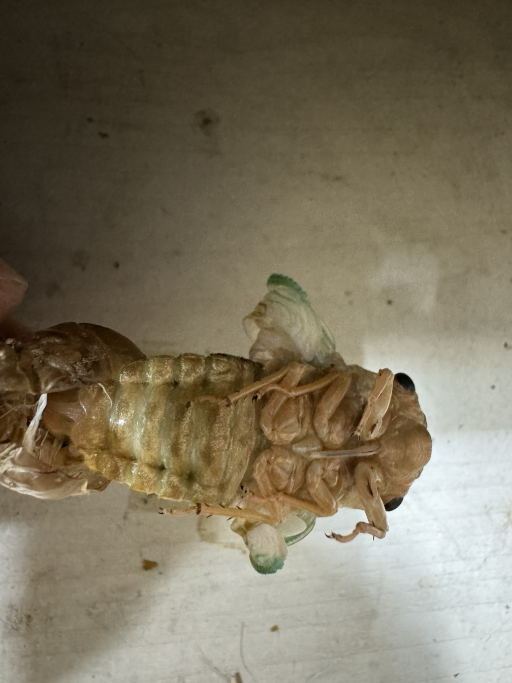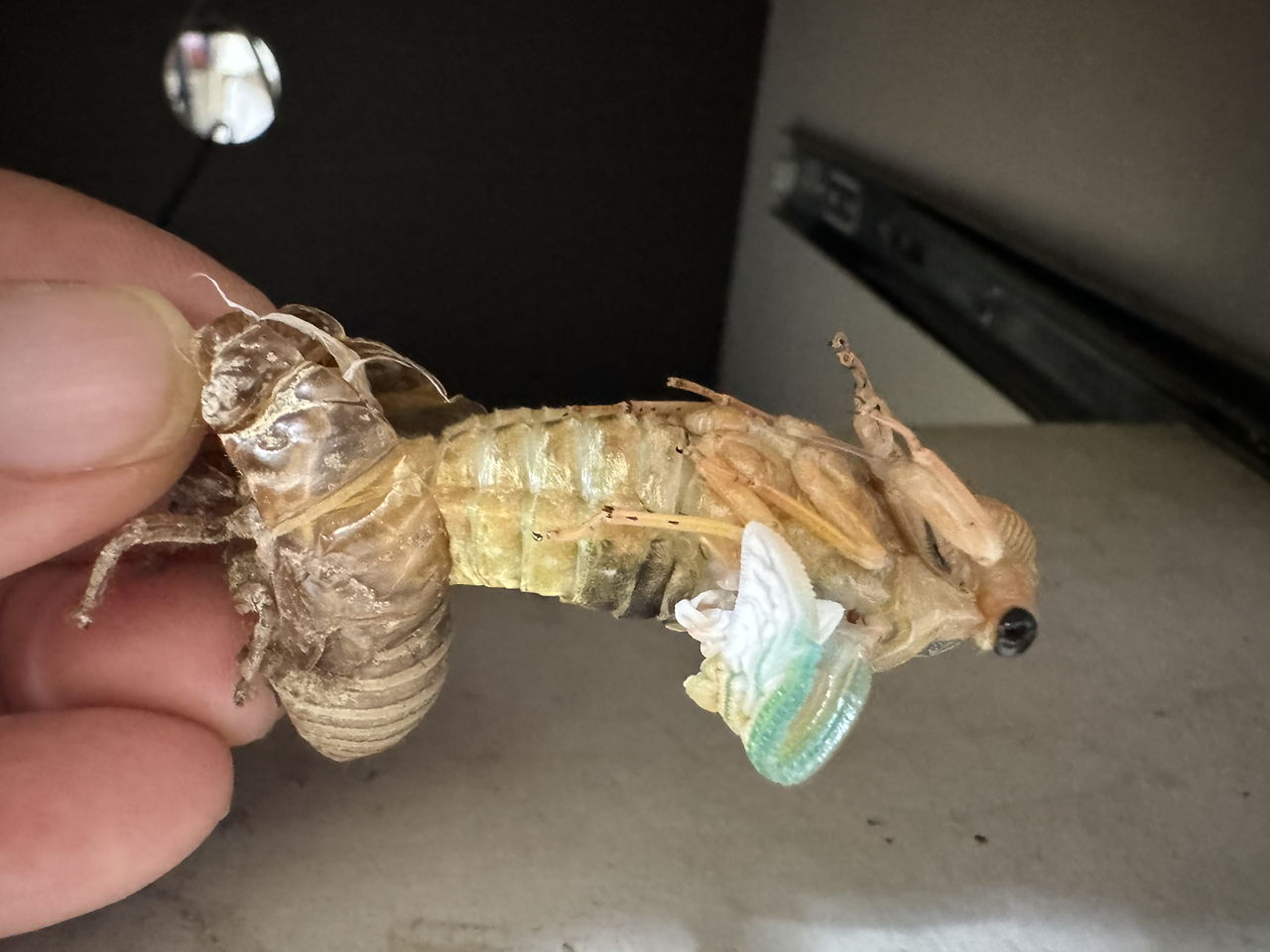 그래서 우화끝나고 날개 피고 피부가 딱딱해질때까지 옆에서 지켜주기로 했습니다. 몸을 3번씩 부르르 떨때마다 몸이 뒤로 넘어 갑니다.