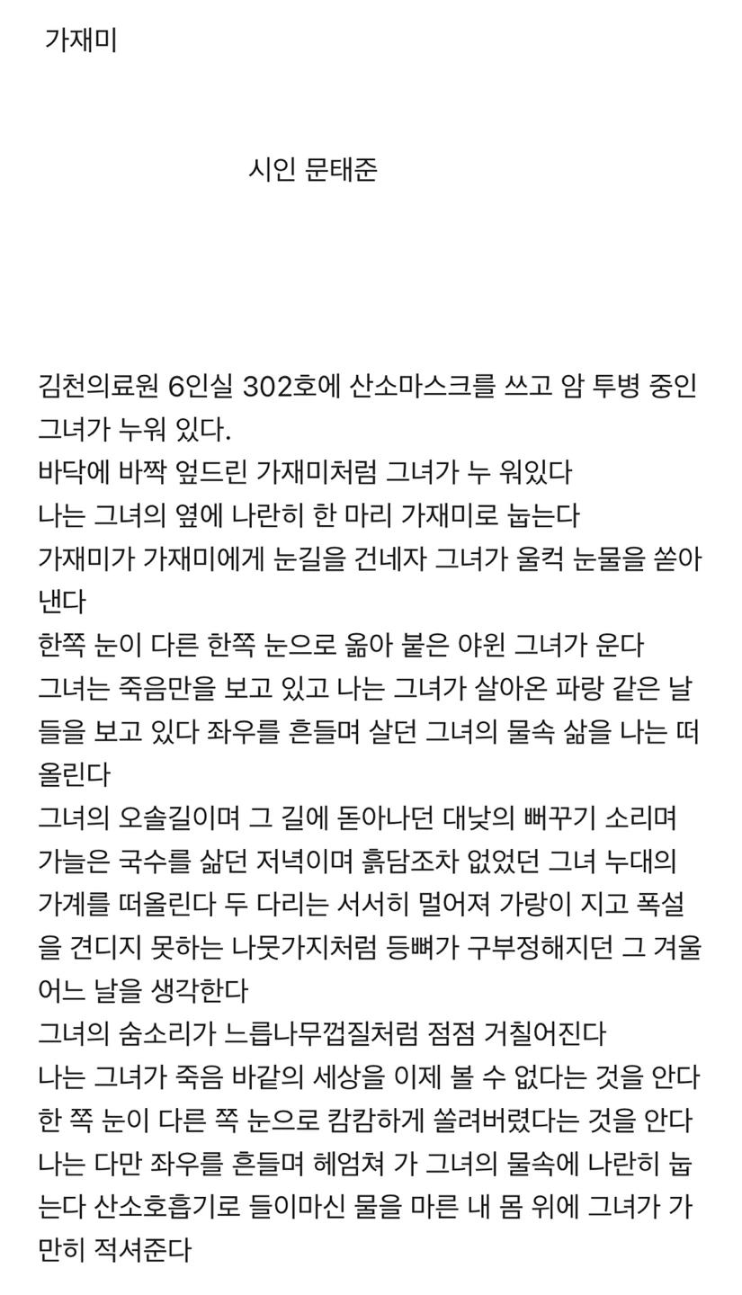 구체적인 병실이 이름이 시인의 경험임을 설명해 준다. 병든 어머니의 모습을 가재미로 표현하여 이제 땅으로 죽음으로 가까이 다가왔음을, 어머니의 죽음이 얼마 남지 않았음을 서글프게 설명한다. 그가 알았던 생기 있었던 어머니는 이제 "한쪽 눈이 다른 한쪽 눈으로 옮아 붙은 야윈" 어머니이다. 죽음의 그림자로 그녀는 대낮의 뻐꾸기소리, 맛있던 국수를 마음껏 누리던 옛날을 뒷전으로 하고 있다.