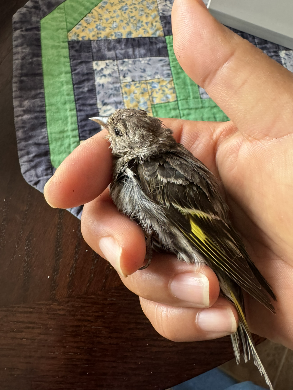 체온이 떨어졌는지 새가 정원 바닥에 앉아 있었어요.
