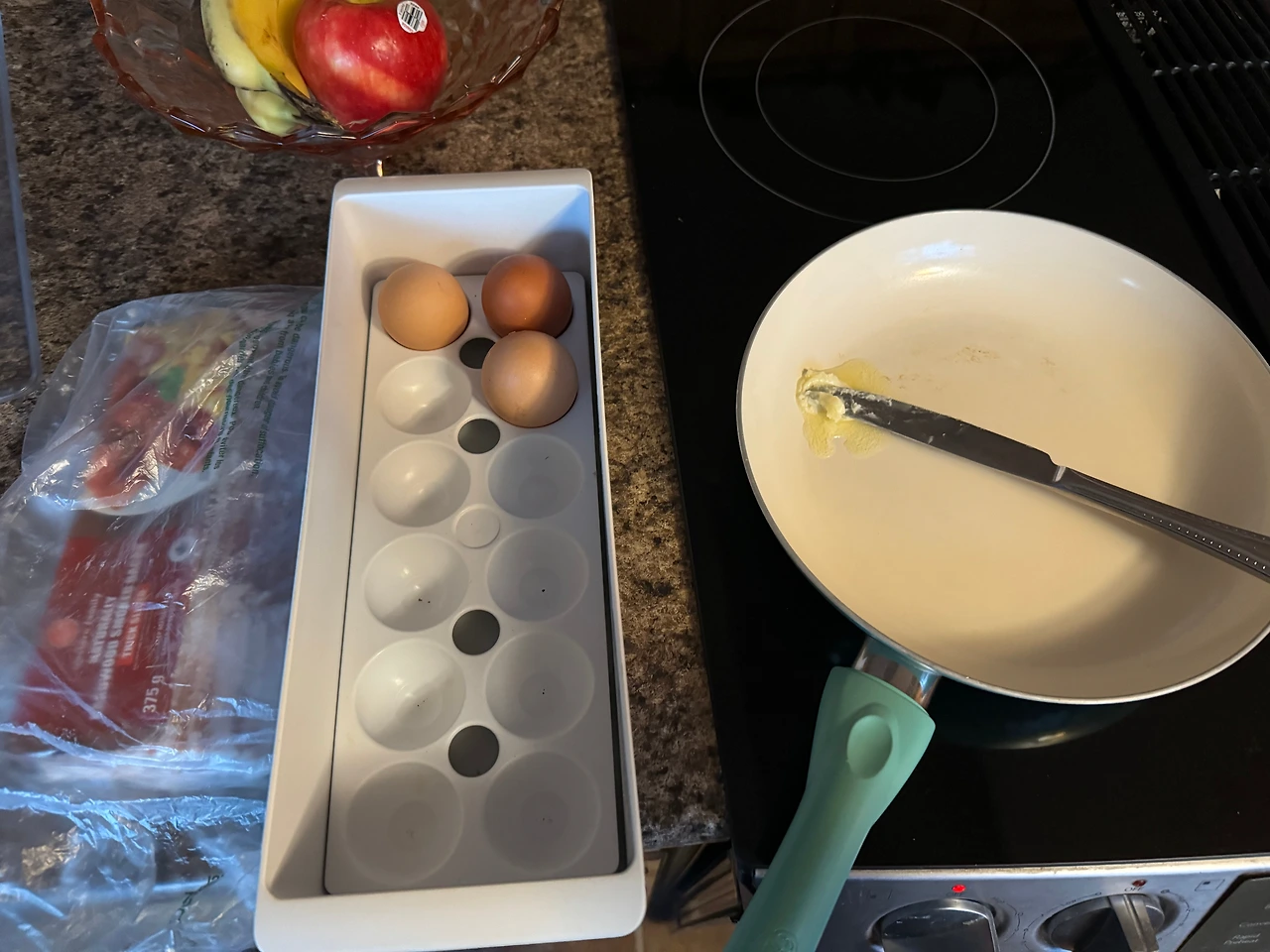 아침에 일어나서 냉장고를 살펴보니 달걀과 베이컨이 있었어요.