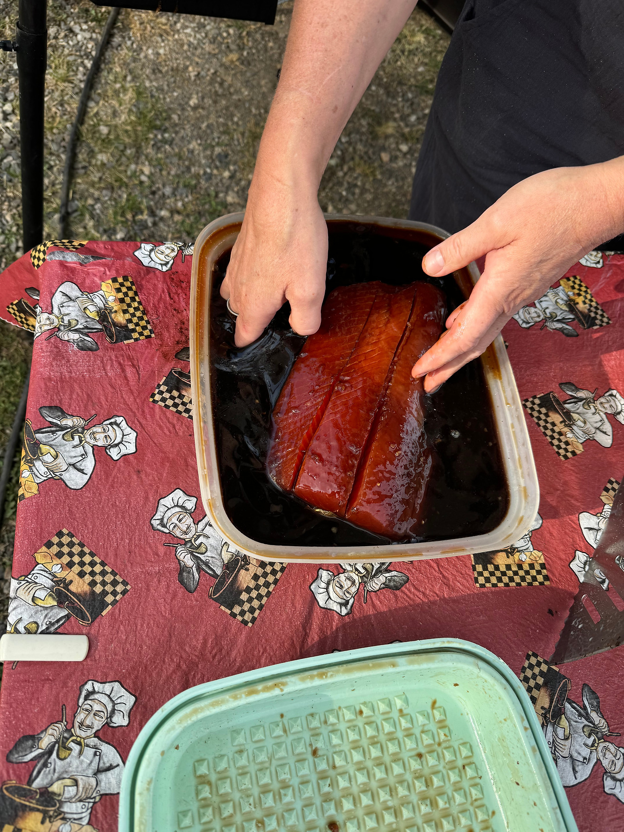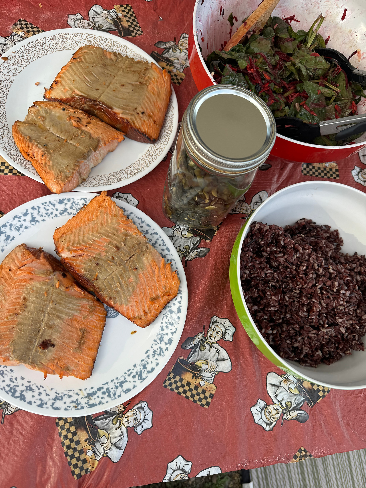 저녁으로 시누이가 오리엔텔 드레싱을 만드는 재료로 양념을 만들어, 거의 양념갈비장 같은 연어를 바베큐 그릴로 구웠어요.