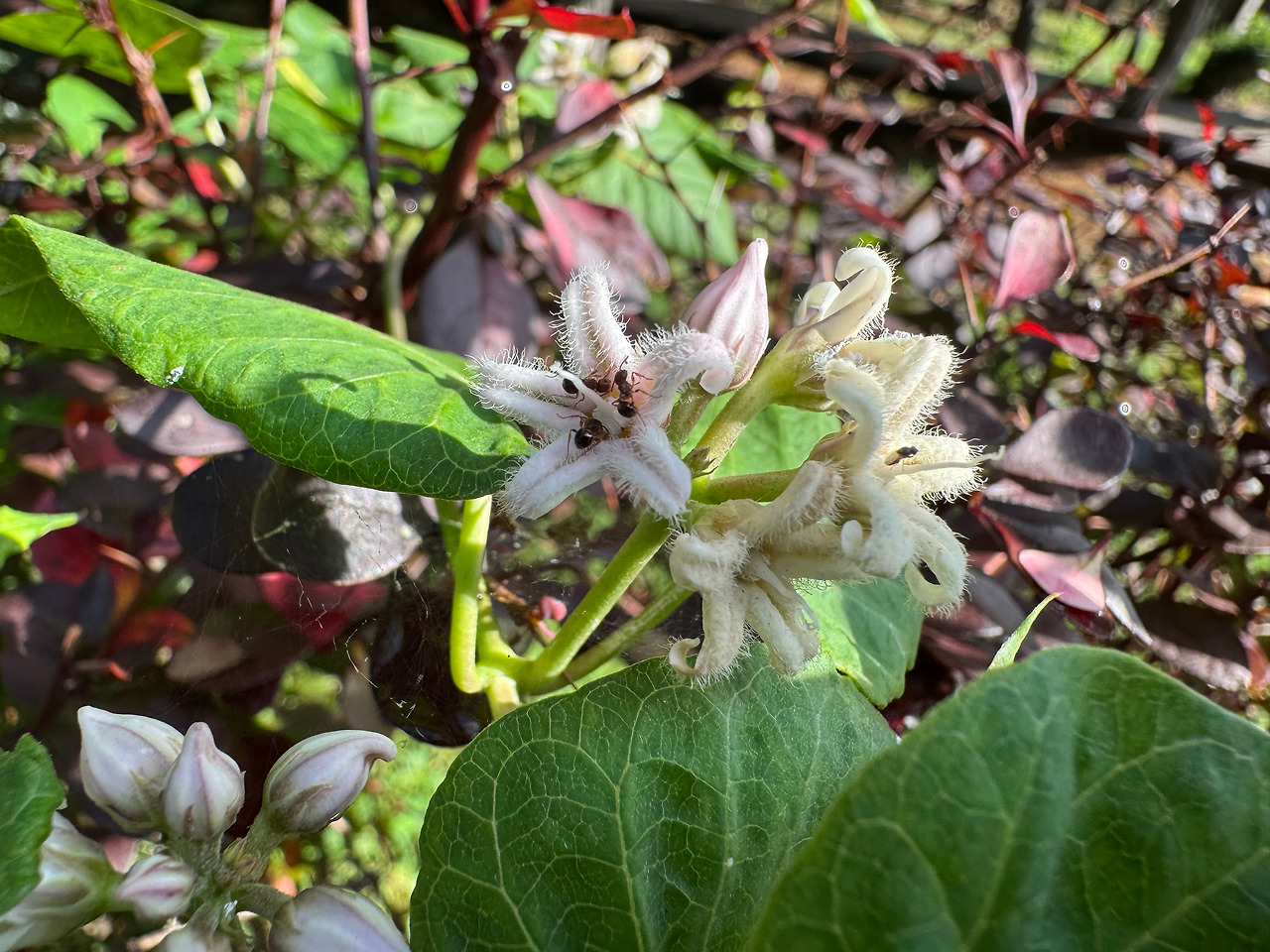 잎을 자르면 우유빛 액체가 떨어집니다. 그래서, 영어로 milky weed[밀키 위드, 우유가 나는 잡초]라고도 불리웁니다. 우유빛 액체는 박주가리를 먹는 곤충에게는 유해한 요소를 가지고 있습니다. 그래서 박주가리를 먹는 중국 청람색 잎벌레는 잎맥을 끊어놓고 잎을 갉아 먹기도 합니다.