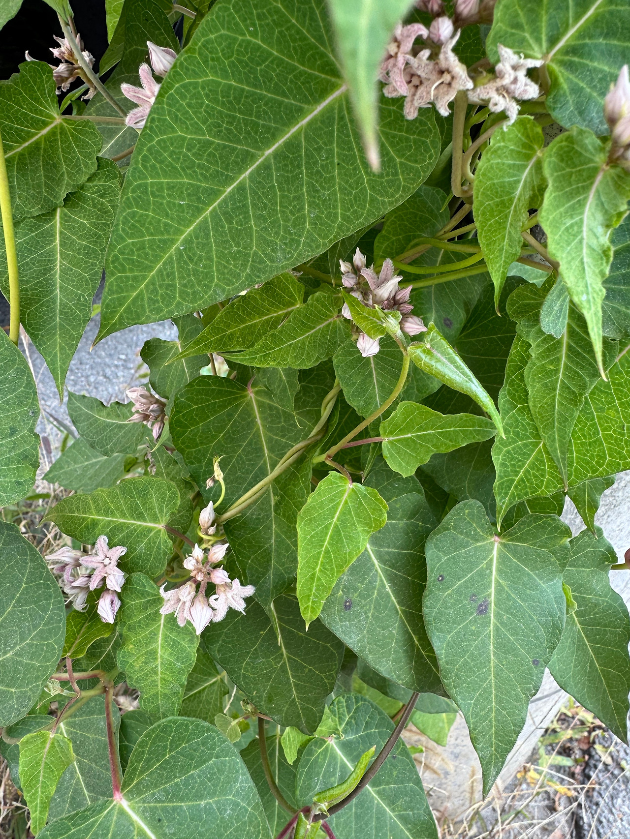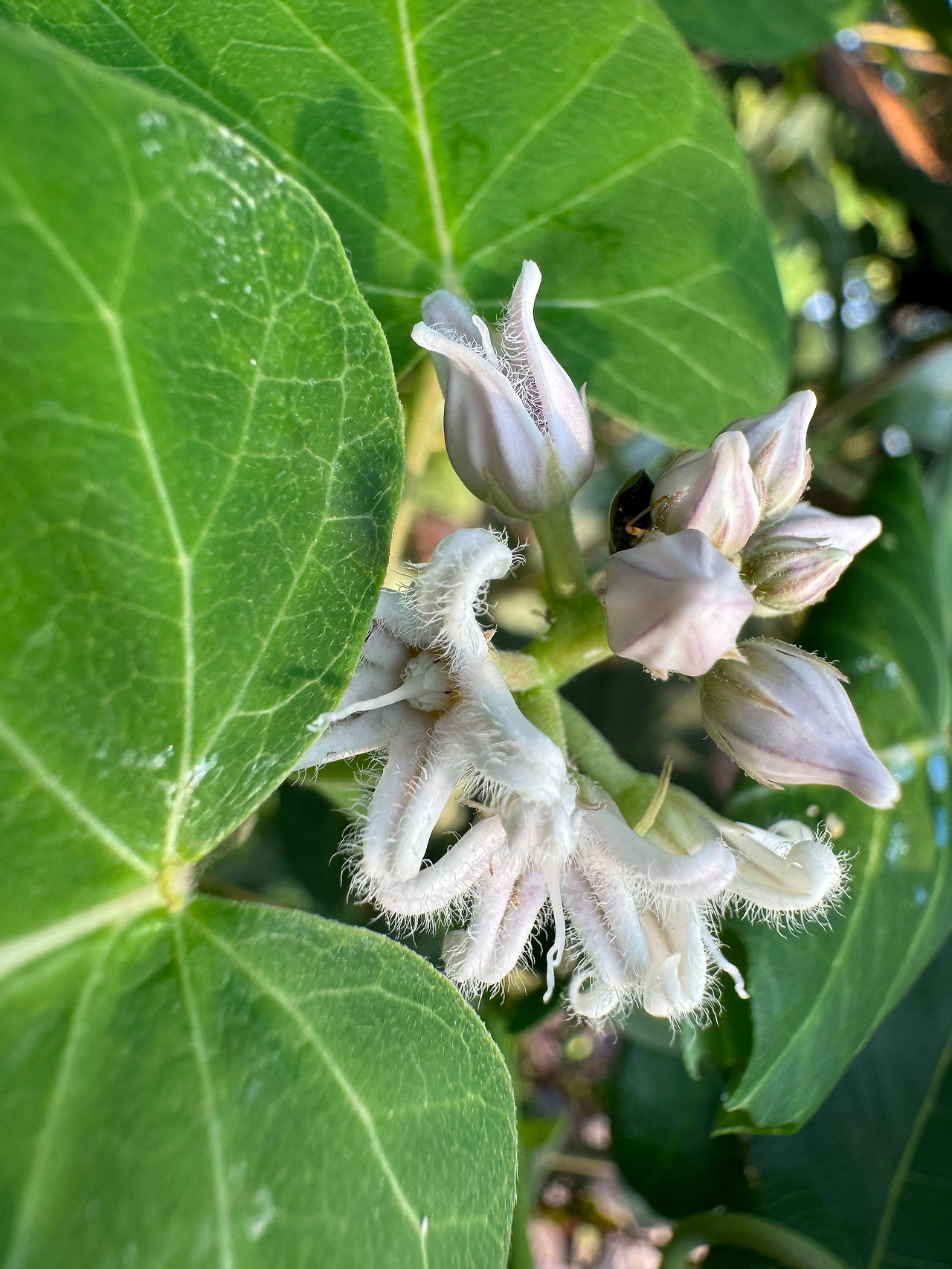 박주가리는 "박주머니"라는 의미를 가졌습니다. 실제로 열매가 타원형 속에 깃털을 달고 무수히 많이 박혀있습니다. 잎은 서로 바라보고 있는 형태로 나 있습니다. 이런 것을 대생이라고 합니다.