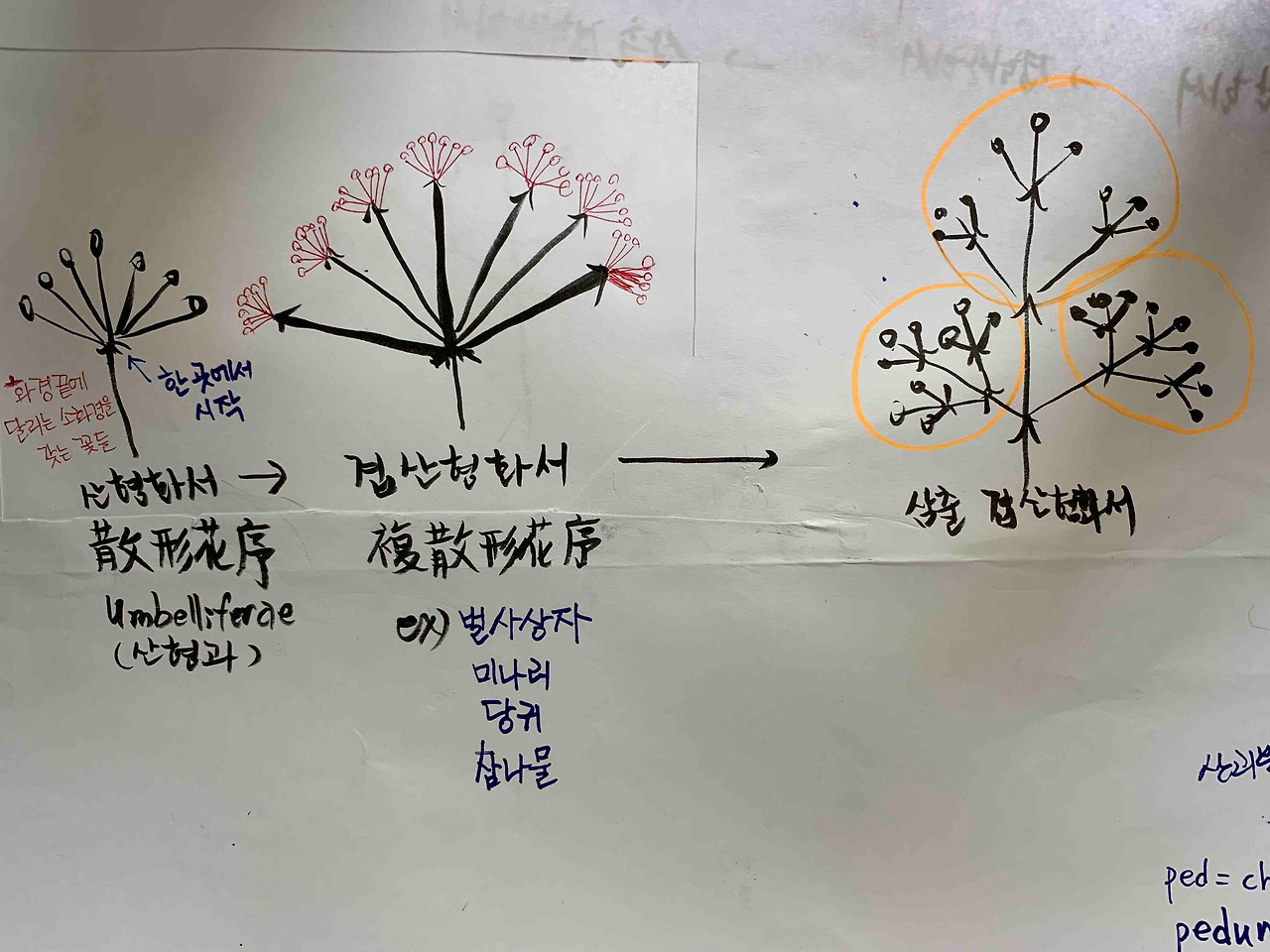 산형꽃차례(산형화서)는 우산살 같은 모양이라서 붙여진 이름입니다. 산형화서에는 산형화서, 겹산형화서, 삼출겹산형화서 등이 있습니다.
