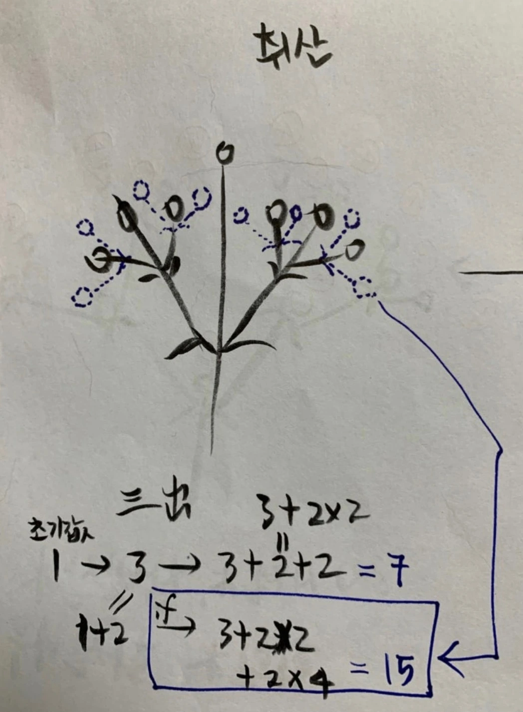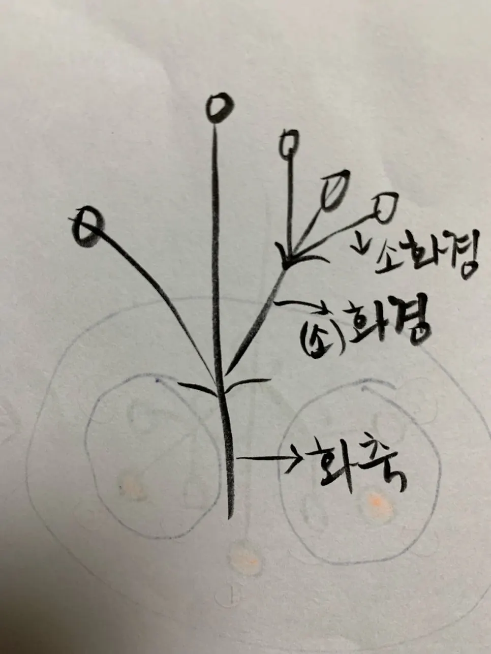 겹취산의 화축, 화경, 소화경(화경외에 꽃을 지탱하고 있는 작은 줄기)가 만들어내는 꽃의 숫자와 일치해요!