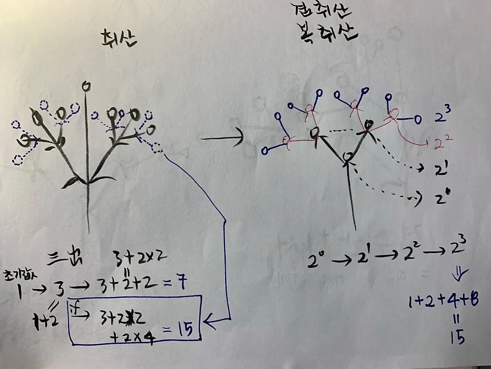 이렇게 보면 겹취산이 꽃을 더 안정적으로 더 많이 생산할 수 있다는 결론이 납니다. 2의 거듭제곱이 가진 기하학적 수치가 흥미롭습니다!