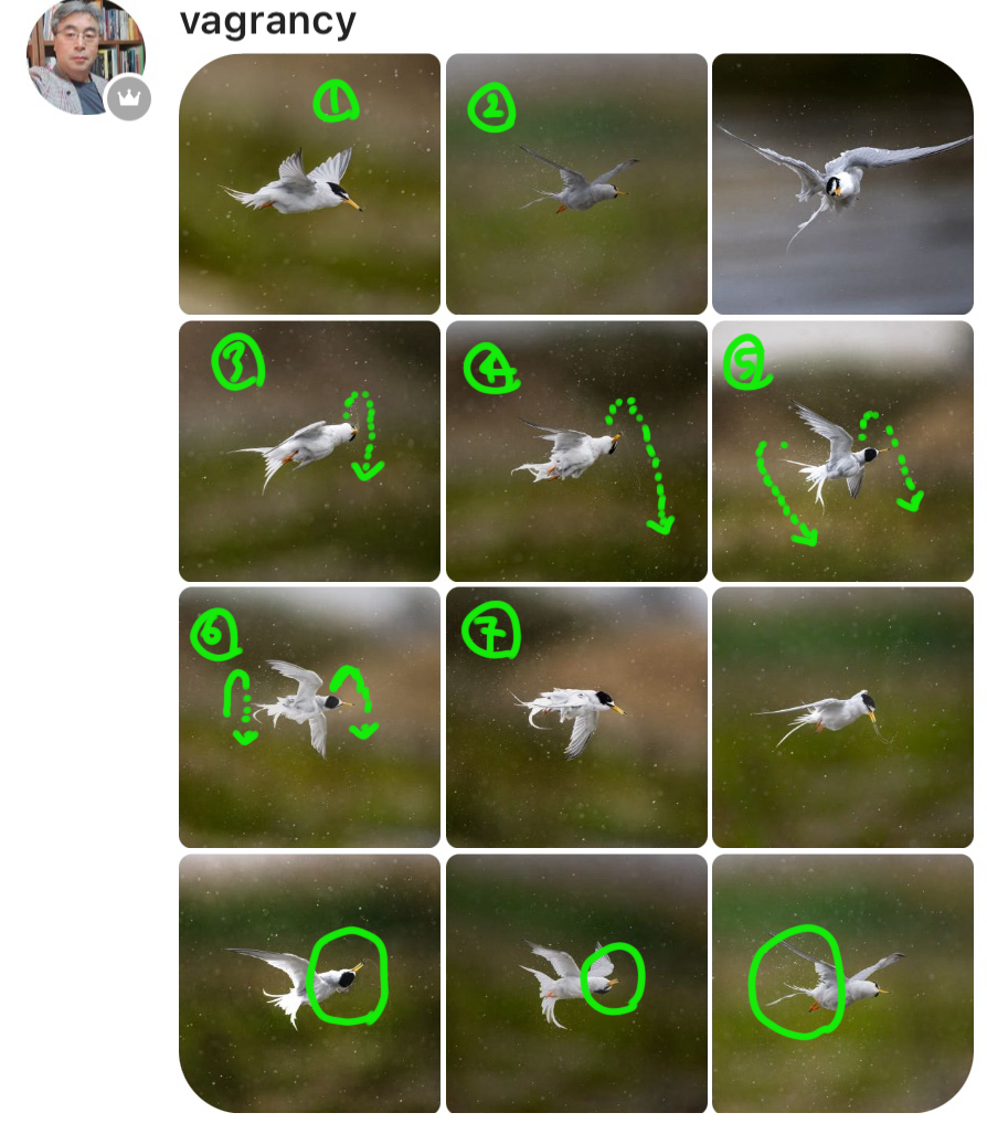 제비와 (쇠)제비 갈매기, 두 개체의 차이점에 주목하고 (쇠)제비 갈매기의 유연한 턴 동작(turn)에 집중해보기로 합니다. 1번과 2번은 전형적인 갈매기의 동작입니다. 빠르게 비행을 잘 합니다. 제가 주목한 동작은 공중제비돌기(수평으로 턴 동작) 입니다. 3-5번 동작을 보면 우선 머리방향을 돌리고 몸을 돌아가는 동작을 취하고 있습니다. 그것도 여러번 연속동작이 가능합니다.