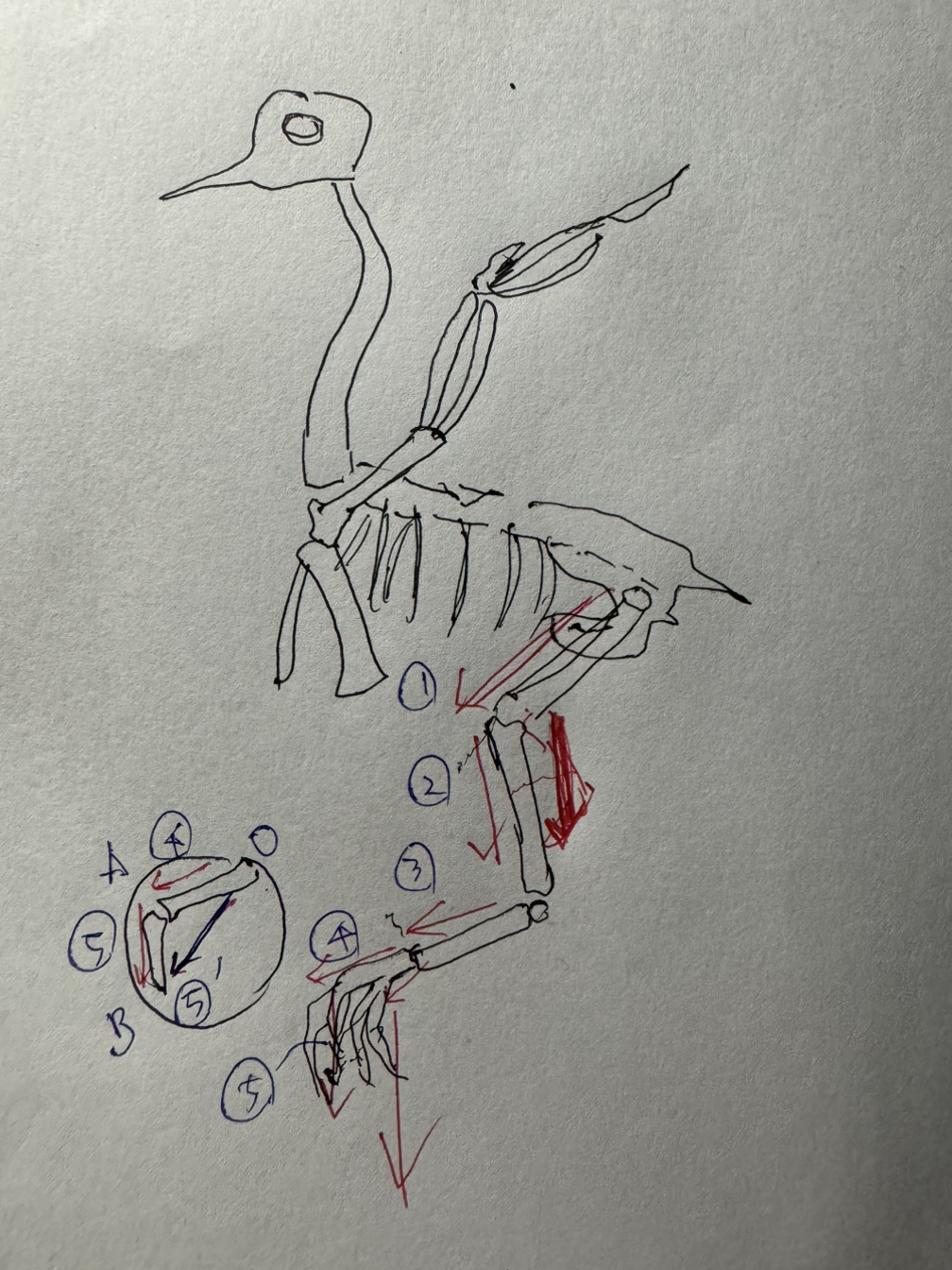 갈매기의 다리 역시도 다른 새와 같이 굽어진 정도가 그림과 같습니다. 바다 위 쾌속정을 탄 관광객에게 새우깡을 받아먹을 때도 3번과 4번 사이의 스냅도 활용하고 4-5번의 휘어진 특성을 활용해 새우깡을 꽉 쥘 수도 있습니다.