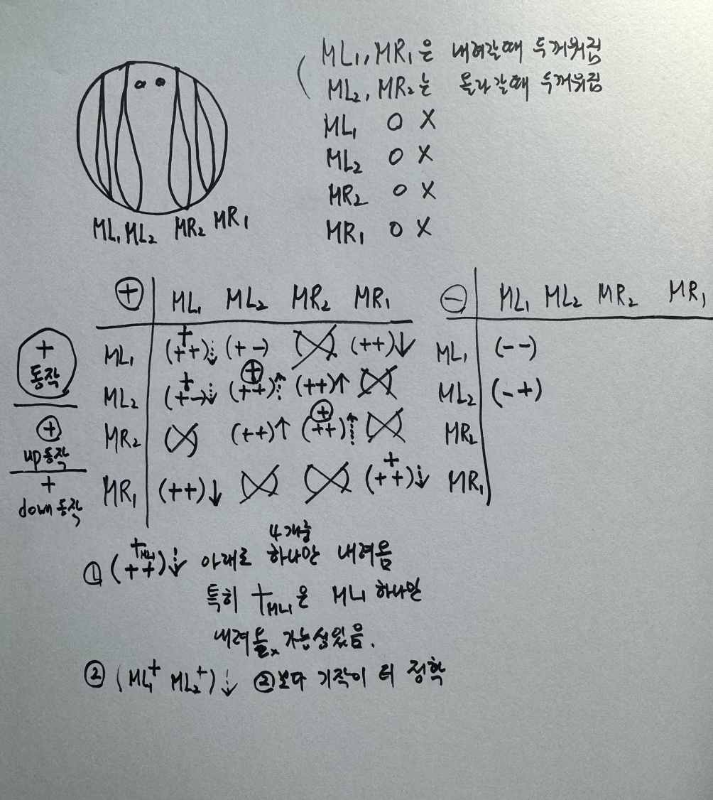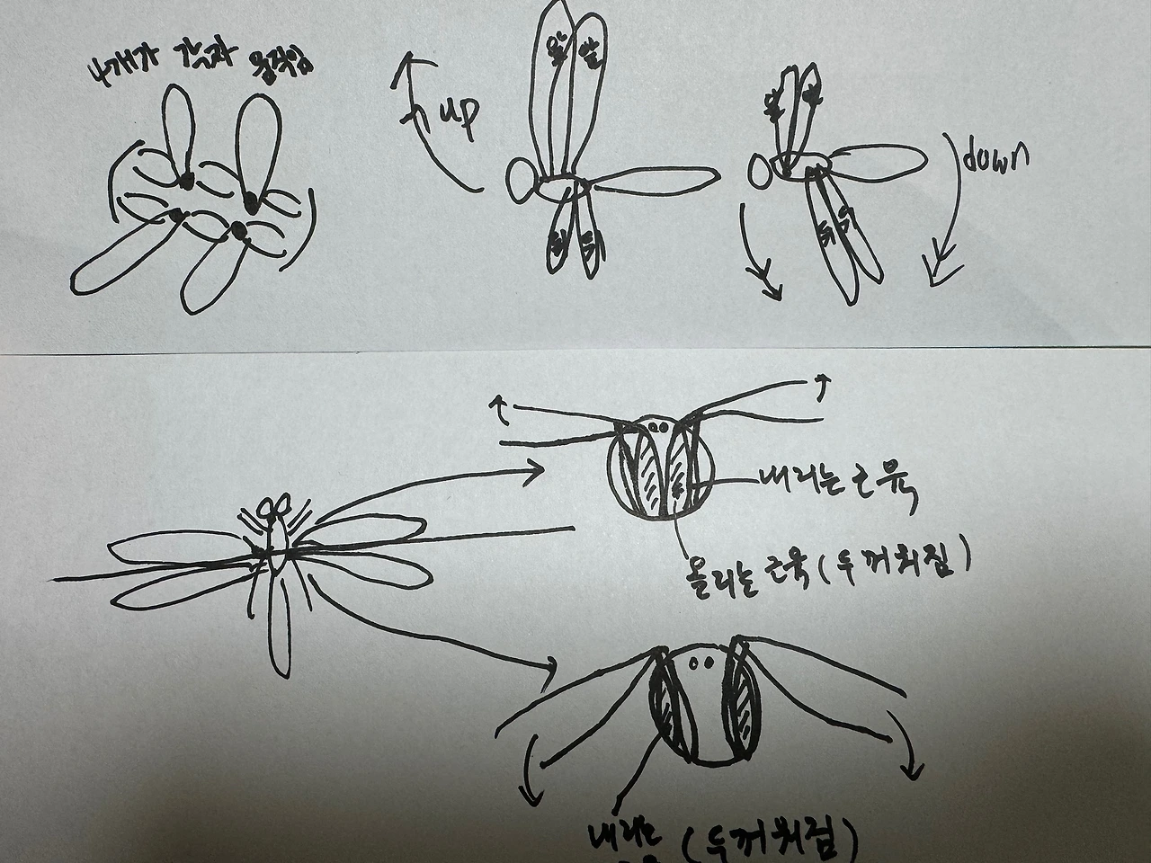 안쪽 근육인 ML2와 MR2가 같이 움직여야 날개가 위로 올라갑니다. 내려가는 경우는 바깥쪽 근육인 ML1과 MR1이 굵어질 때 입니다. 근육중 어느 하나만 굵어지면 4개중 한 개 날개만 움직입니다.