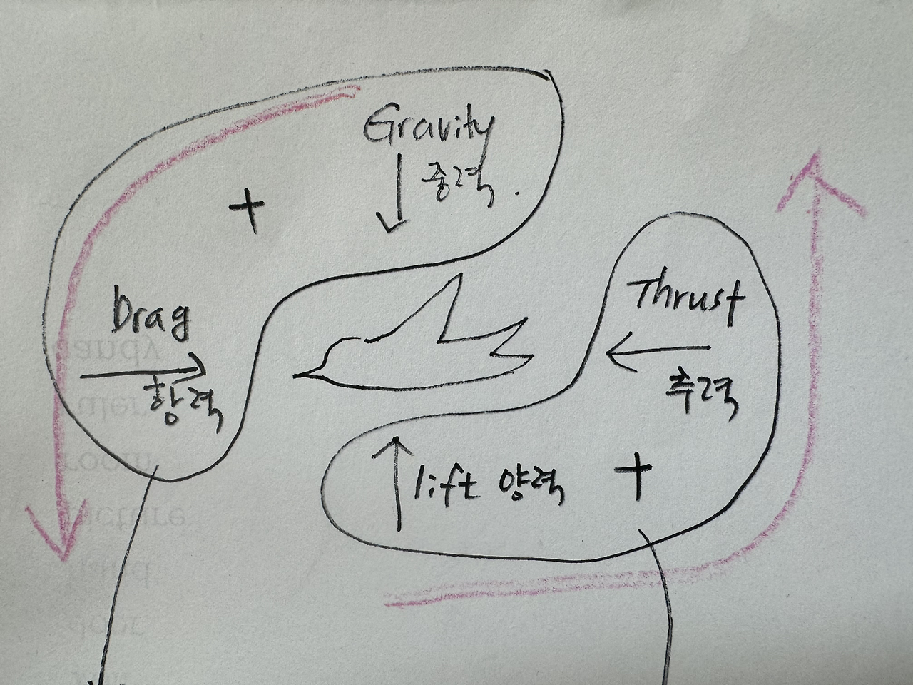 양력(떠오르는 힘)과 추력(앞으로 나아가는 힘)이 필요합니다. 그러나 뉴튼의 힘작용에 따르면 반작용이 발생하는데 위 힘의 반작용을 각각 중력(무게)과 항력(공기저항력)이라고 합니다.