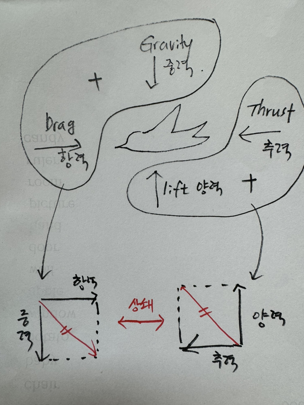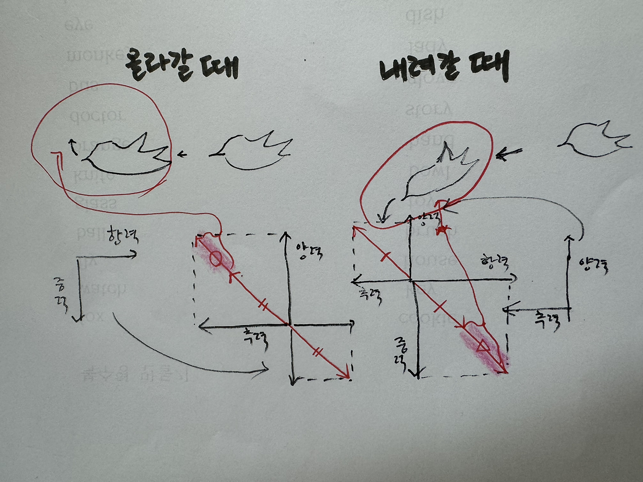 그런데 새가 상승(위를 향해 날기)과 하강(아래로 향해 날기)를 하면 아래와 같이 벡터힘이 작용합니다.