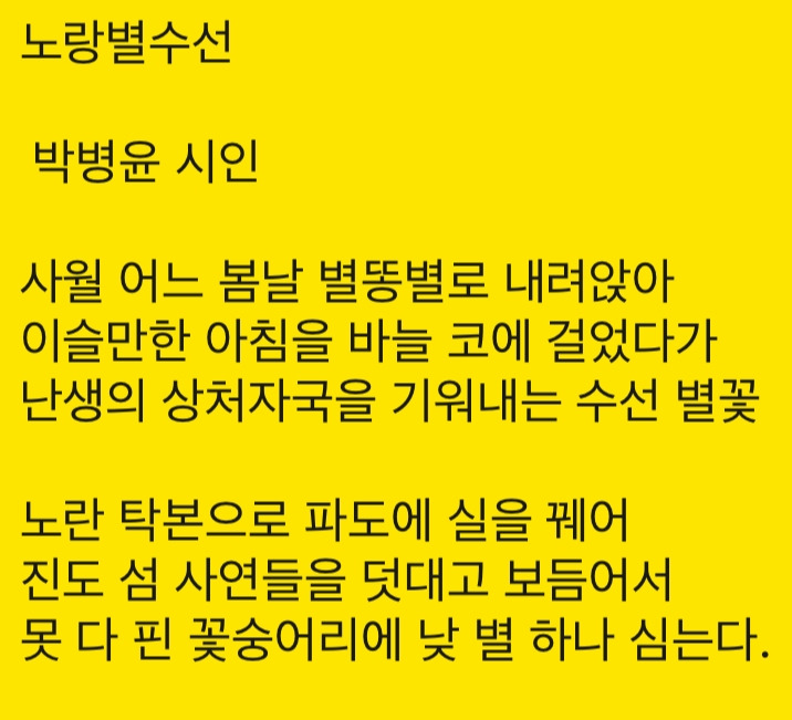 시적 화자는 사월의 어느 봄날 노랑별 수선과 우리의 순수한 학생들을 겹쳐본다. 화자는 노랑별 수선의 한 떨기 별과 같이 떨리는 작은 꽃으로 그들을 묘사한다. 그 작은 꽃을 닮은 그들이 우리를 스쳐지나간 별똥별 같다고 말한다. 진도에 흩어진 노랑별 수선꽃처럼 그들은 우리로 인해 상처받은 어린 꽃으로 바람에 흔들린다. 작은 꽃들은 바람에 흩어질 새라 잎새와 줄기를 간신히 땅에 붙인 채로 바람에 몸을 싣는다. 우리 아이들의 순수한 영혼은 그렇게 그 야트막한 언덕에서 우리를 부른다. 욕망과 욕심이 찌든 우리를 원망하지도 않는다. 단지 진도 그 작은 섬에 핀 그들은 4월이 왜 잔인한 달인지 우리에게 일러준다.