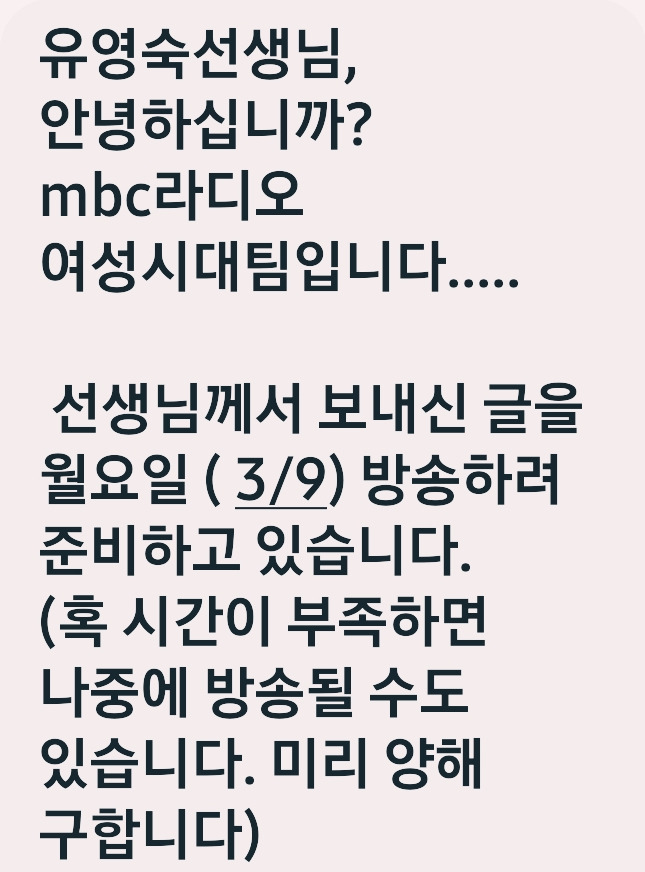 '여성시대' 게시판에는 그날도 정말 많은 사연이 접수되어 있었다. 사연이 채택되리란 확신은 없었는데 사연을 접수한 다음 날인 토요일에 여성시대에서 문자가 왔다. 처음으로 보낸 사연이 채택된 거다. 어찌나 기쁜지 가족 톡방에도 자랑했다.