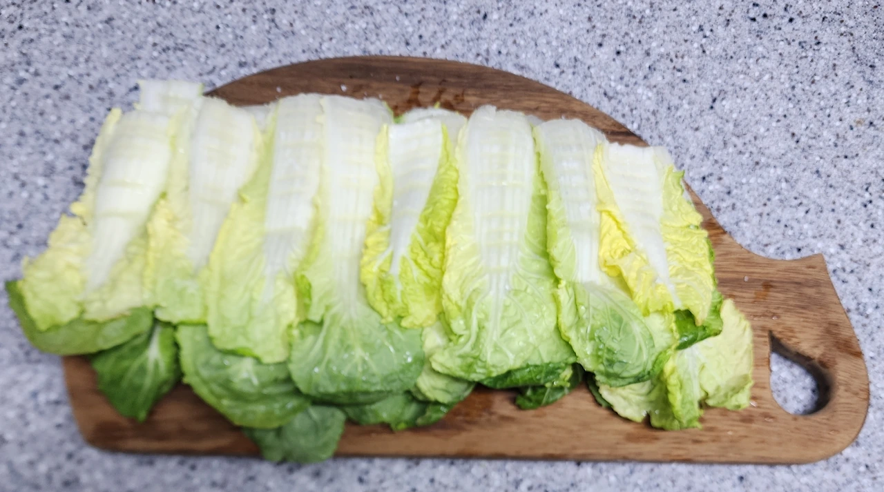 1. 봄동 끝부분을 잘라서 한 잎 한 잎 깨끗하게 씻는다. 10분 정도 물에 담가두었다가 씻으면 봄동 잎에 붙은 흙 등이 잘 씻어진다. 겉껍질과 안쪽에 있는 작은 잎은 사용하지 않고 따로 두었다가 된장국 끓일 때나 샐러드에 사용한다.