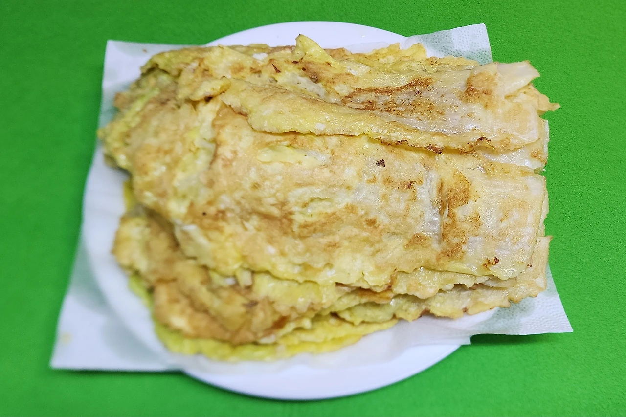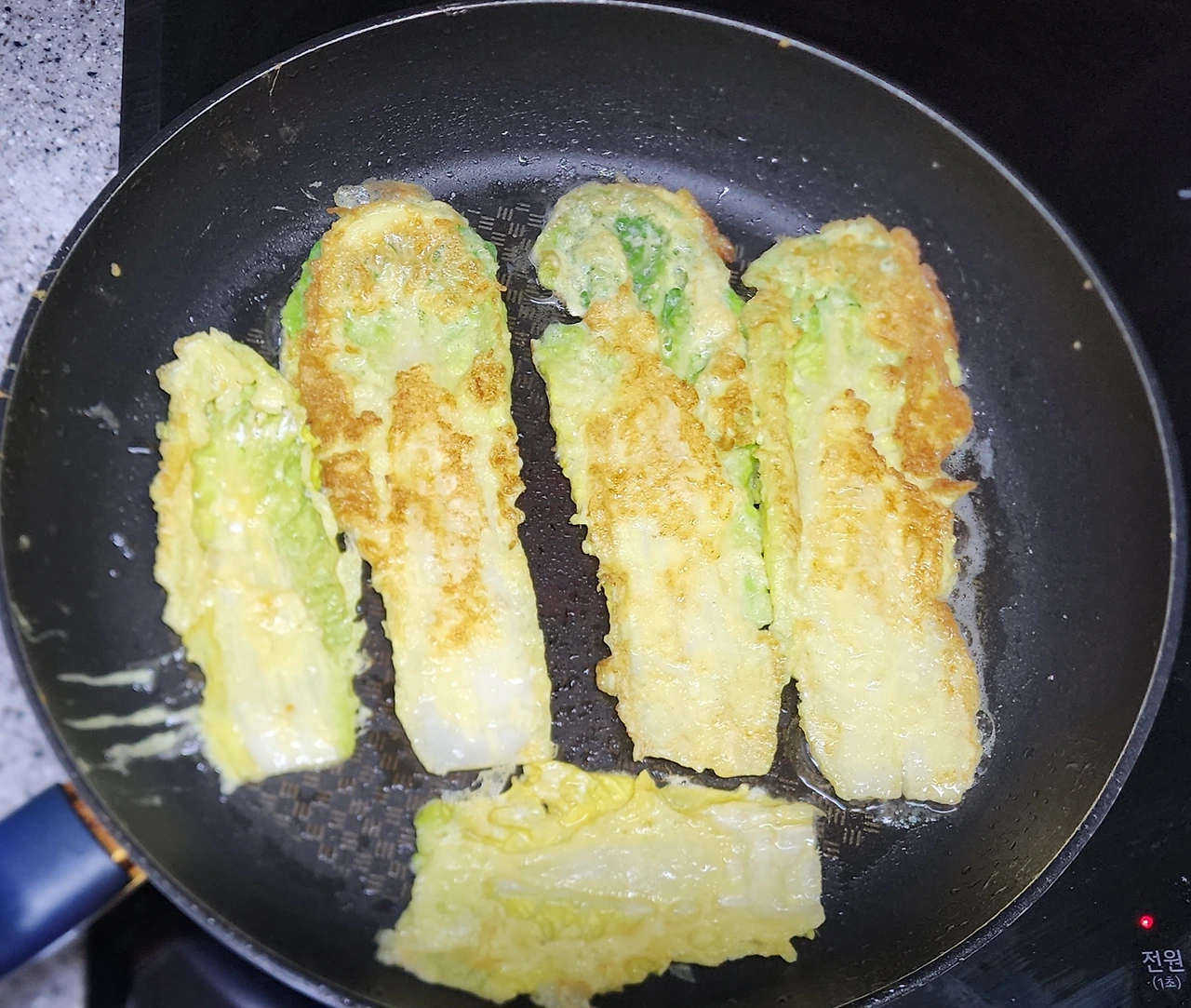 6. 가루 묻힌 봄동을 달걀물에 적셔서 프라이팬에서 부친다. 이때 달걀이 흐르지 않게 털어주면 달걀물이 얇게 묻는다. 식용유만 넣어도 되는데 고소하게 먹으려고 식용유와 들기름을 2대 1로 섞어서 지져낸다. 달걀을 입혀서 부치는 거라서 중간 불로 해서 타지 않게 한다.