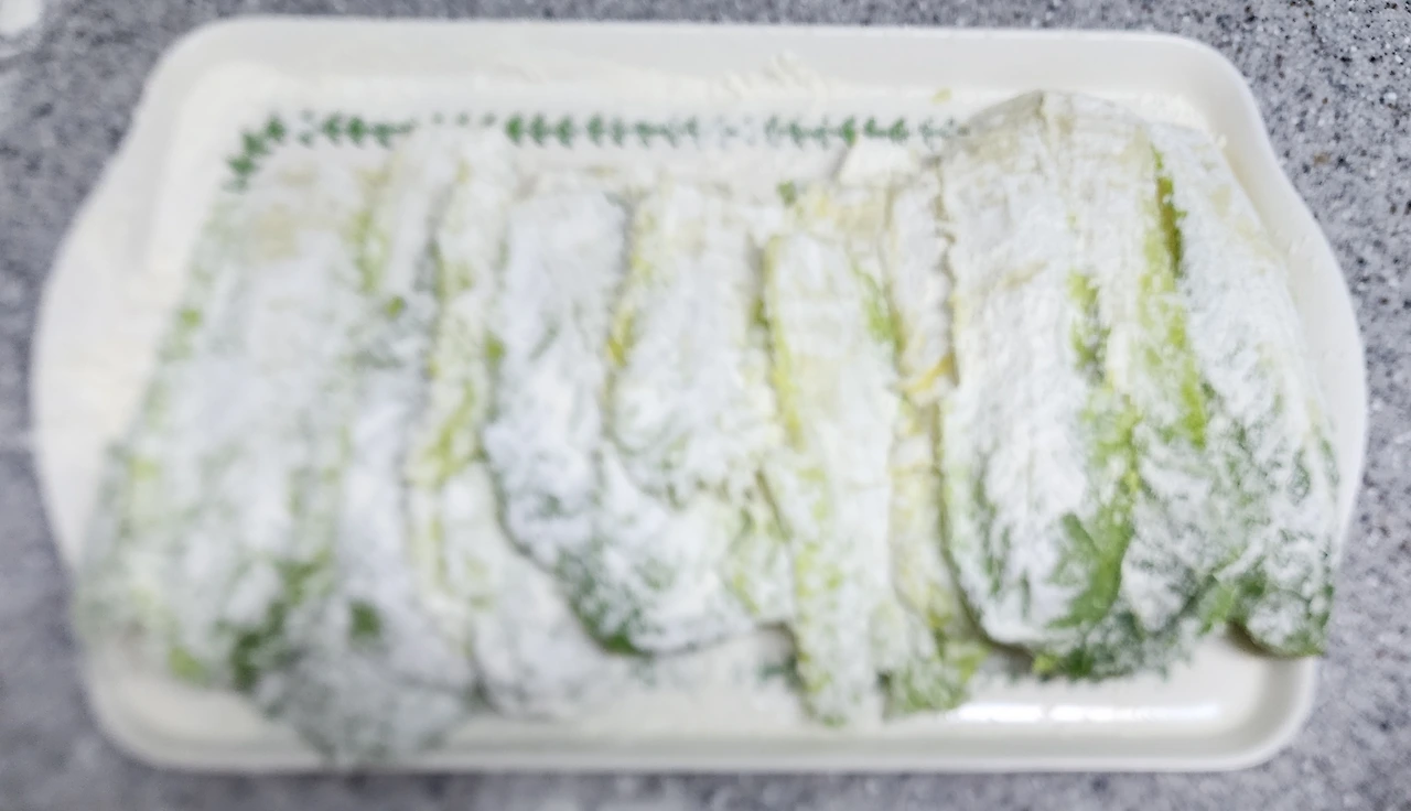 5. 봄동 앞뒤로 가루를 꼭꼭 눌러 골고루 묻게 하고 두껍지 않게 가루를 털어준다. 달걀물이 잘 묻게 하려는 거라서 골고루 묻게 하는 것이 좋다.