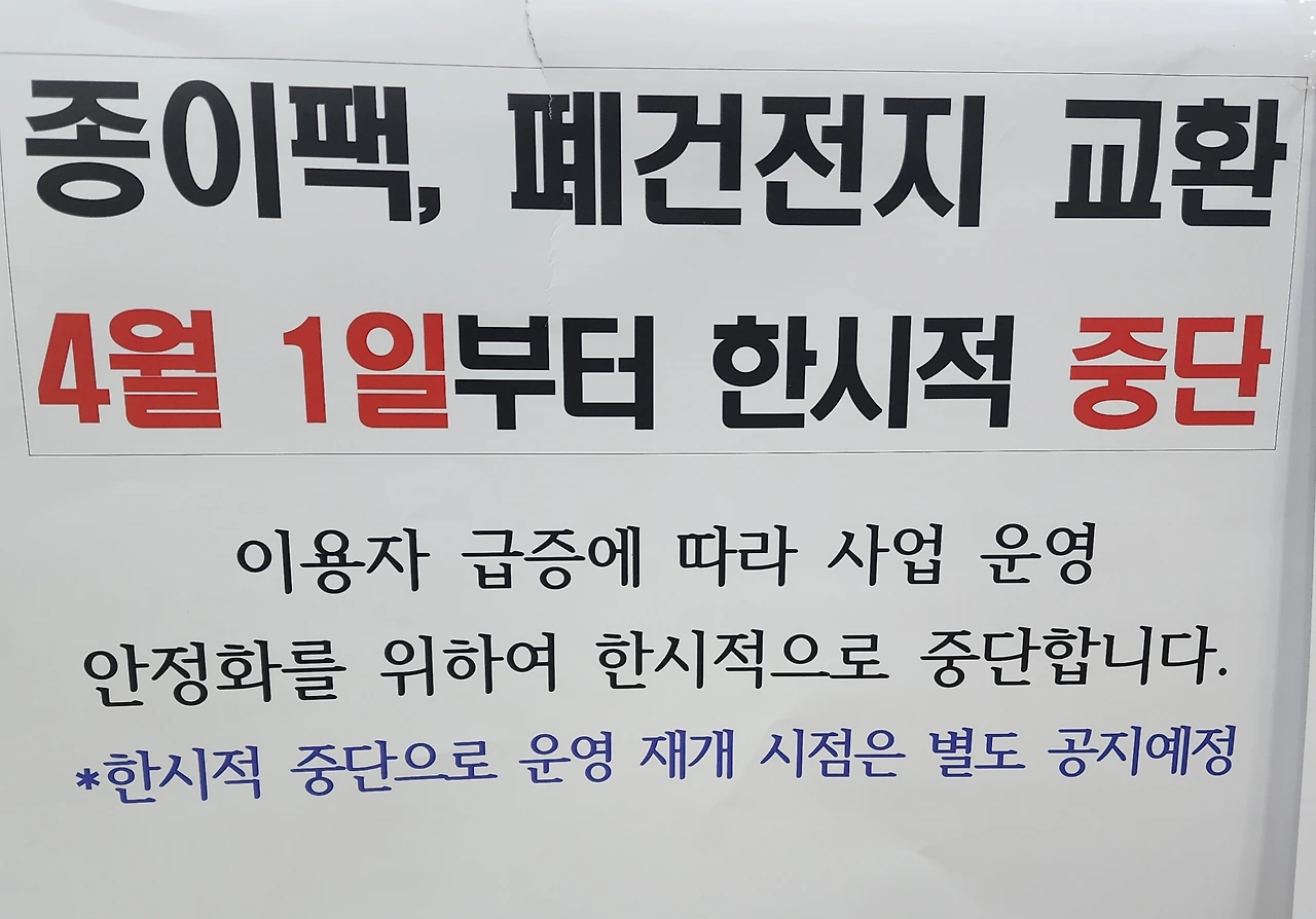 먼저 페트병을 네프론에 넣고 행정복지센터에 들어갔다. 가끔 갔던 곳이라서 종량제 봉투 바꾸어 주는 창구로 갔다. 그런데 담당 직원이 자리에 없었다. 자리 옆을 보니 '종량제 봉투 수급으로 당분간 종이팩과 건전지를 수거하지 않는다.'라는 안내문이 붙어있었다.
