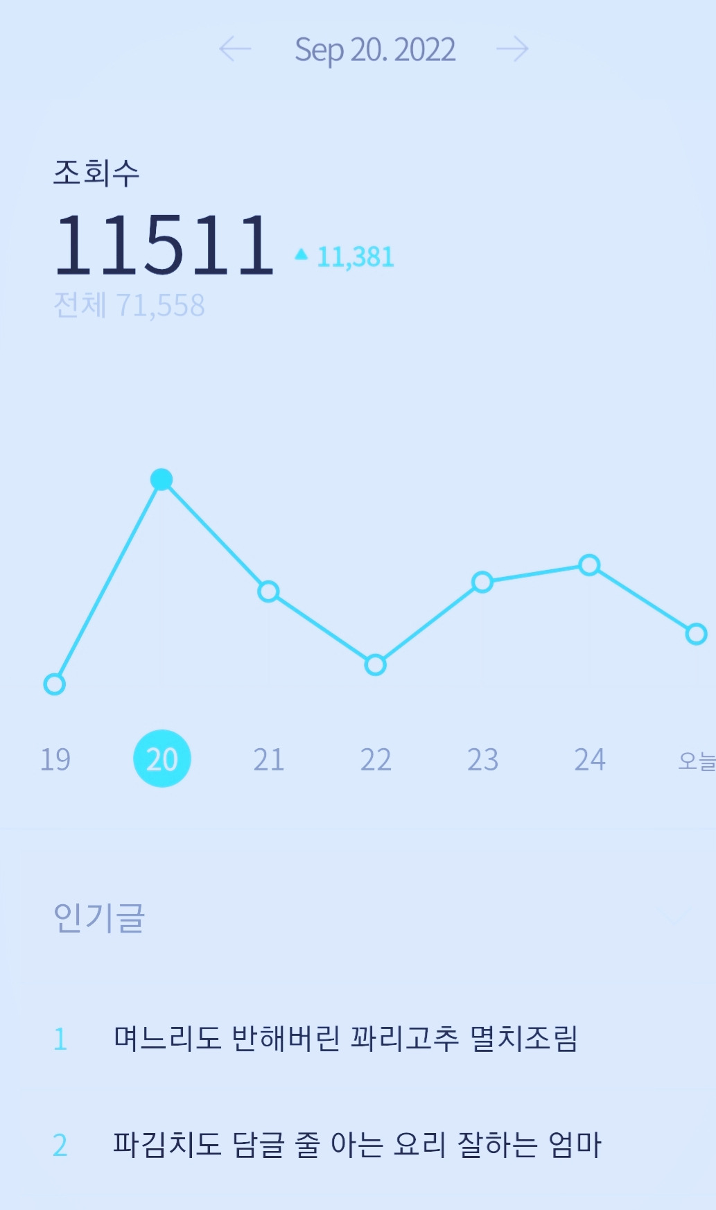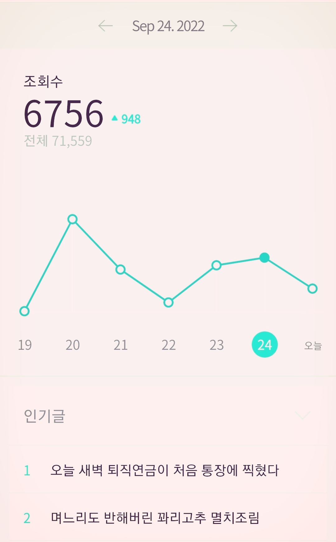 내 글이 브런치 인기글 메인에 오를 줄은 상상도 못 했다. 그것도 같은 날 글 두 개가 인기글 메인에 함께 오른다는 것은 더더욱 생각할 수 조차 없었다. 9월 23일 오후 4시경부터 퇴직연금 글 조회수가 1000을 돌파했다는 알림이 올라와 기다렸는데 2000, 3000으로 계속 올라가서 브런치 인기글을 검색하게 되었다. 꽈리고추 멸치조림 글은 이틀 정도 브런치 인기글 메인에 올랐다가 오전에는 안보이더니 23일 저녁에 퇴직연금 글과 나란히 메인에 나타났다. 퇴직연금 글은 메인 끝에 있다가 시간이 지나면서 조금씩 앞쪽으로 옮겨 앉았다.