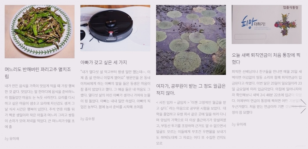 지난번 커피차 글이 조회수가 14,000을 넘길 때 올라갔을 수도 있는데 그땐 브런치 초보라 검색하는 것조차 몰랐었다. 이번에 올린 꽈리고추 멸치조림 글은 커피차를 넘어 17,000이 넘었고, 퇴직연금 글도 현재 15,000을 넘기며 커피차를 앞질렀다. 가끔 브런치 인기글에서 글 벗님들의 글을 만나기만 해도 너무 반가웠다. 저절로 내가 아는 작가님의 글이라 다시 한번 읽어보게 되었었는데 내 글이 인기글 메뉴에 나타나서 너무 신기했다.