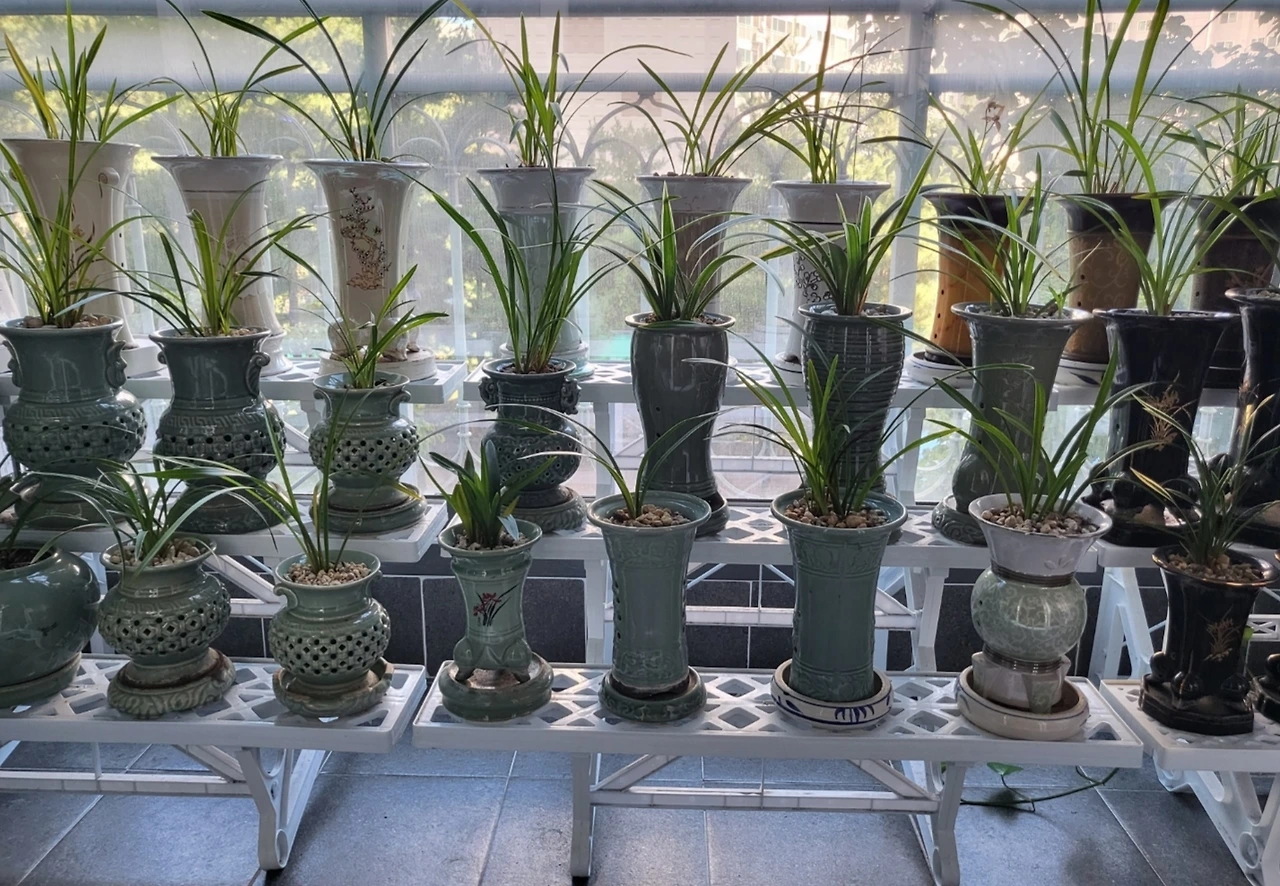 이렇게 해서 우리 집에서 난을 키우게 되었다. 처음에는 화분이 많지 않았는데 매년 분갈이를 해주며 조금씩 늘려가고 살다 보니 화분이 생기기도 하였다. 짝꿍이 사진작가로 등단하고 매년 동료 사진작가님들과 전시회를 하면 또 난 화분이 생겼다. 함께 운동하시는 짝꿍 동네 친구분이 시의원으로 당선되어 받은 난을 나눠 주셔서 지금은 40개가 넘는다.