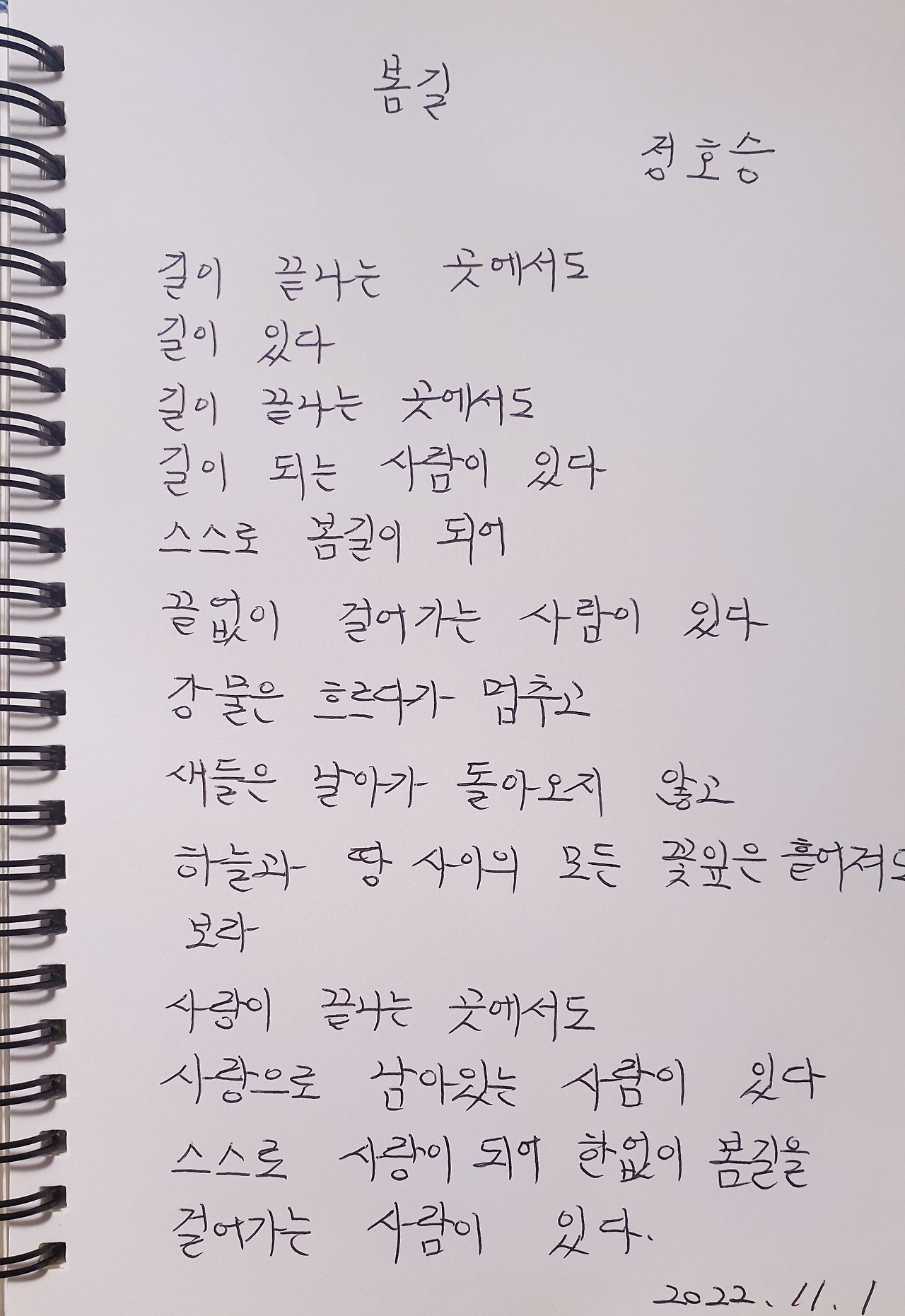 정호승 님의 '봄길'은 8월 말 퇴임식 때 교감선생님께서 송공사를 하며 낭송해 주신 시다. 퇴임식날 시 낭송을 들으며 너무 감동이 되어 시를 찾아보았다. 읽을수록 퇴직하는 나에게 길을 알려주는 좋은 시란 생각이 들었다. 나도 정호승 시인이 말하는것처럼 '길이 끝나는 곳에서도 길이 되는 사람'이 되고 싶다.오늘 시를 필사하고 11월 첫날을 정호승 님의 '봄날'로 시작한다. 11월 한 달도 의미 있는 한 달이 되기를 기대해 본다.