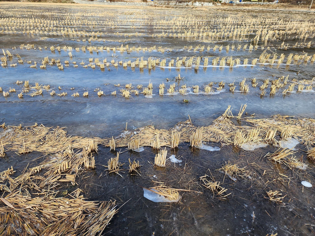 추수한 논 물 가두어 밤새 꽁꽁 얼려