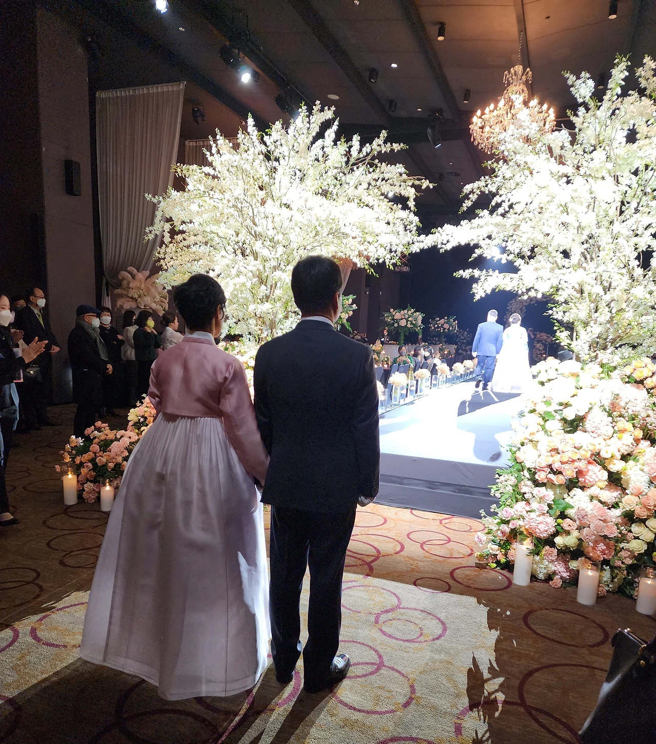 결혼식 식순 첫 번째로 보통은 양쪽 엄마들이 손잡고 먼저 입장하여 화촉을 밝히는데 오늘은 신랑 부모님이 입장하고 그 뒤에 신부 부모님이 입장하였다. 입장 후에 아버지들은 자리에 앉고 엄마 두 분이 화촉을 밝혔다.