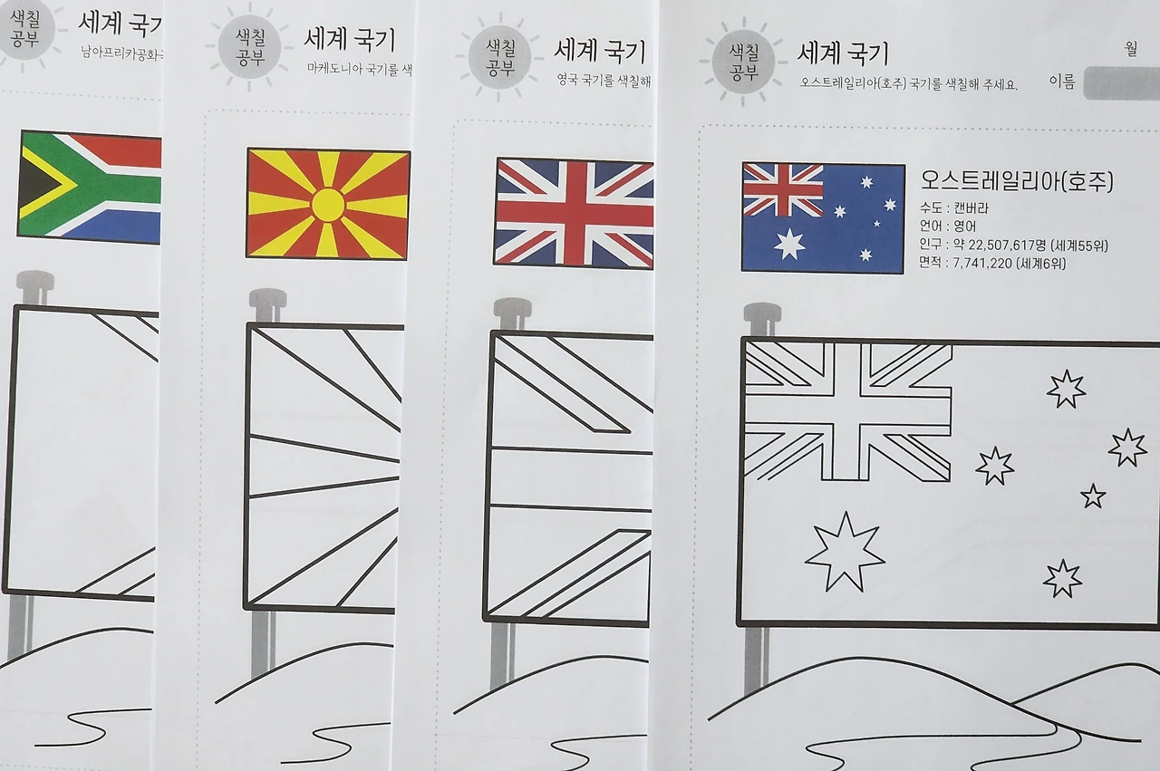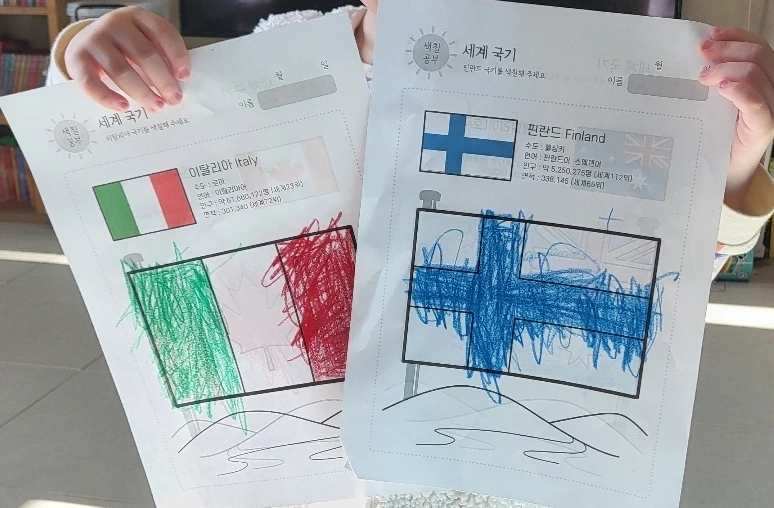 며느리 톡으로 도안 자료를 보냈더니 며느리도 너무 좋은 자료라고 한다. 색칠하기는 우리나라태극기를 포함해서 23개 나라다. 프린터로 출력하여 색연필이나 크레파스로 색칠하면 된다. 한 번에 두 개 나라 정도가 딱 맞는 분량이다. A4사이즈로 출력해도 되는데 할아버지가 욕심을 내서 A3로 출력해서 가지고 왔다. 사이즈가 크니 좋긴 하다.