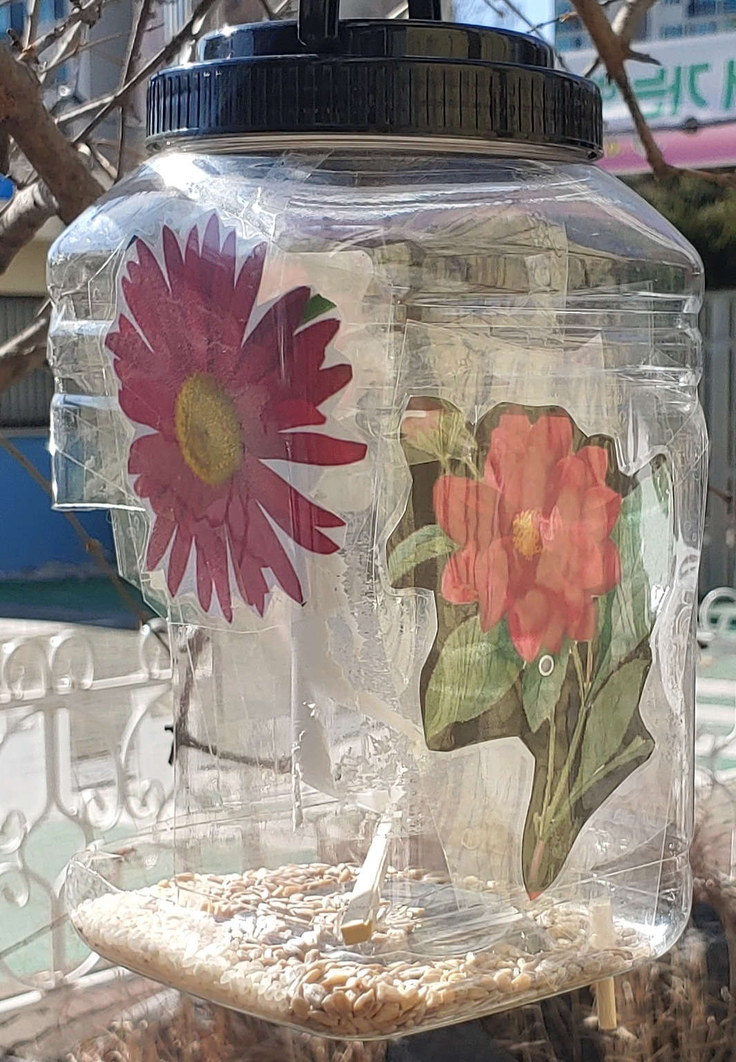 햇빛에 반사되는 것을 줄이고자 외부에 꽃그림 스티커를 붙이신다고 한다. 새들이 와서 먹이를 먹는 모습을 보며 새들의 놀이터가 아니라 지금은 학교보안관님이 보고 즐기는 안식처가 되어 가고 있다고 하신다.