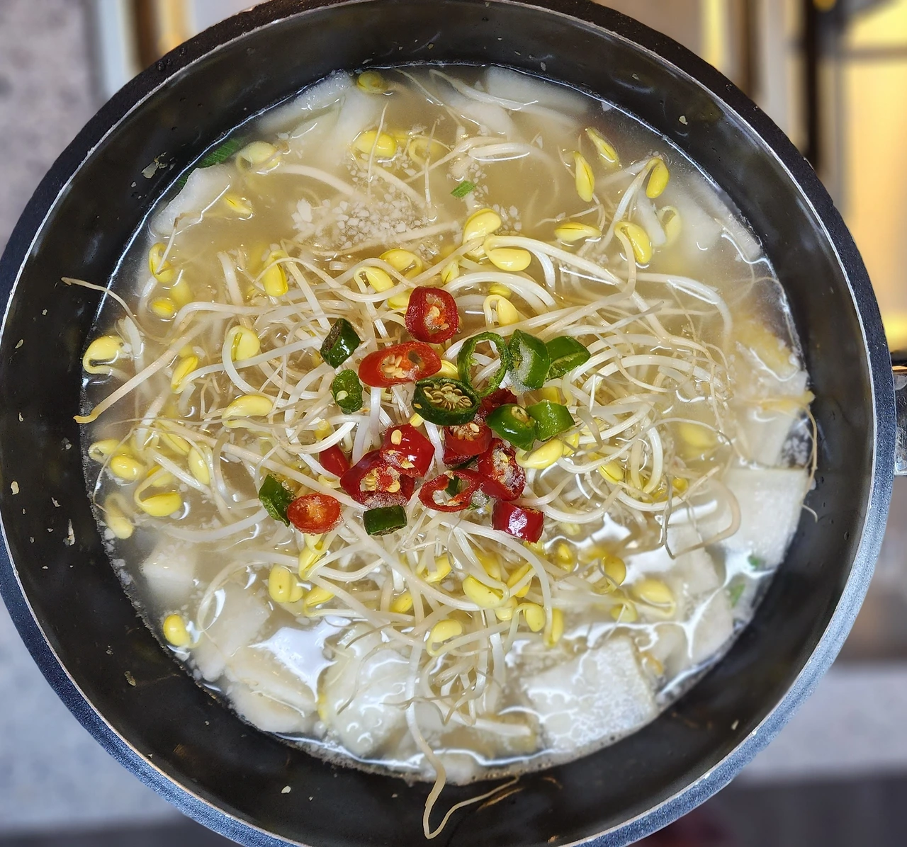 이제 물 1.5리터를 넣고 콩나물을 넣어 뚜껑을 닫고 한 소끔 끓인다. 홍고추와 청양고추 썰은 것을 넣고 새우젓 한 스푼을 넣었더니 조금 싱거워서 한 스푼 더 넣어 간을 맞추고 마지막에 썰어놓은 대파를 넣었다.