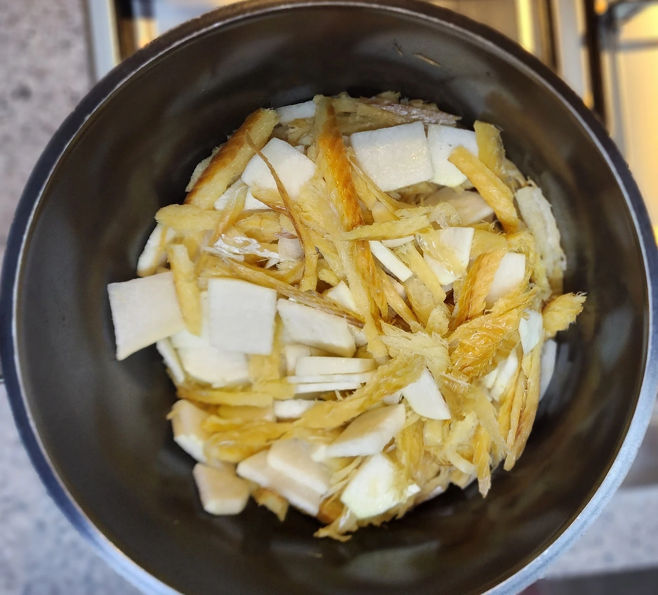 냄비에 황태채와 무, 마늘 한 스푼(마늘 두 조각)을 넣고 참기름 두 스푼을 넣어 볶아주었다. 볶다가 탈 것 같아 물을 조금 넣고 국간장 두 스푼을 넣고 달달 볶았다. 미역국을 끓일 때도 참기름에 소고기를 볶다가 미역을 넣고 볶아준다. 이때 국간장을 넣고 볶아주면 미역에 간이 배어서 미역국이 맛있다. 황태채와 무에 간이 배어 끓였을 때 무가 싱겁지 않고 맛있다.