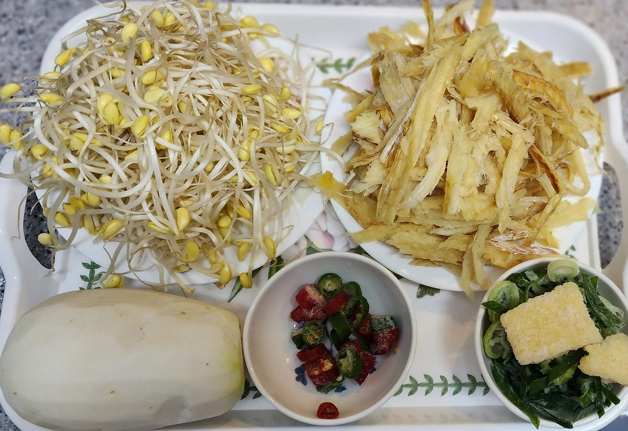 마침 사다 놓은 콩나물도 한 봉지 있고 강화도 갔을 때 얻어온 작은 무도 있어서 재료는 충분했다. 거기다가 우리 집 냉동실에는 늘 썰어서 보관되어 있는 파와 청양고추, 갈아놓은 마늘이 있으니 준비는 완벽하다.