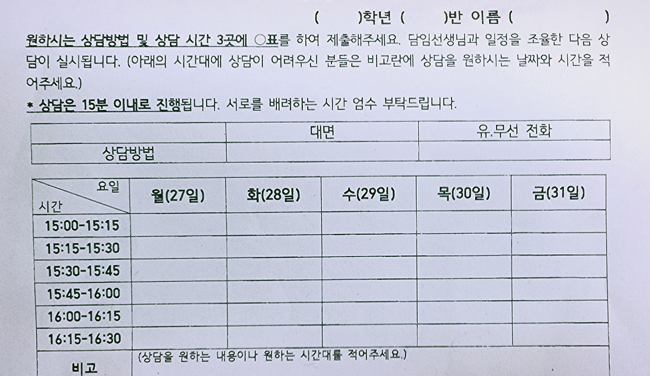 상담 계획을 짜다 보면 겹치는 시간도 있지만 대부분 원하는 시간으로 해 드리려고 노력한다. 학부모님 중에서 딱 한 곳만 표시해서 보내시는 분이 계시다. 그 시간만 가능하다고 생각하여 가급적 그 시간으로 해 드리려고 노력한다. 학부모님께서 세 개 정도 원하는 시간대를 적어서 보내주시면 좋을 것 같다. 우리 반은 두 분 정도 원하시는 시간대에 배치해드리지 못해서 따로 연락을 드렸다.