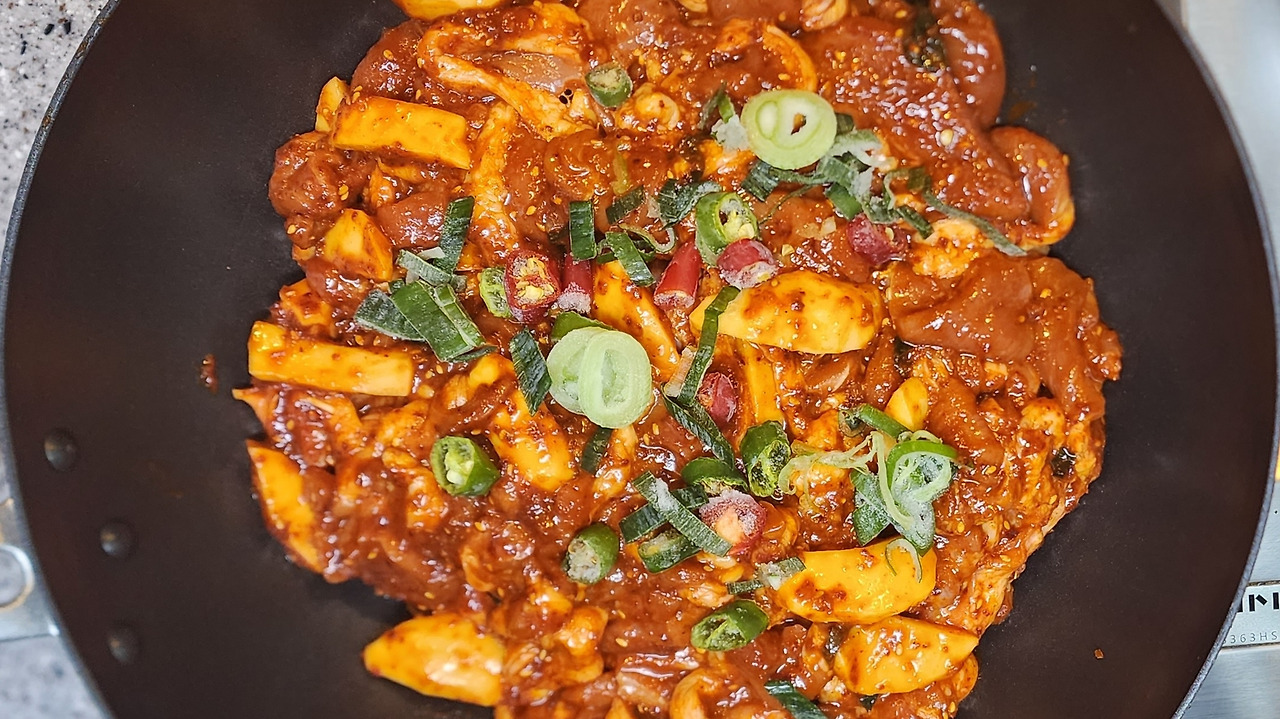 남은 오리고기를 우유와 물을 섞어서 20분 정도 담가두었다. 그러면 오리 특유의 냄새를 없앨 수 있다. 잘 씻어서 썰어놓은 양파와 썰어놓은 감자를 넣고 만능 고추장 양념에 재워 두었다. 웍에 넣고 볶다가 마지막에 썰어놓은 미나리를 넣고 살짝 더 볶았다.