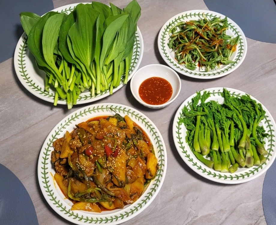 오늘은 봄나물로만 차렸다. 오리 주물럭과 명이나물, 초고추장 뿌린 돌나물 그리고 두릅과 초고추장이 전부다. 남편이 오랜만에 칭찬을 하였다. 오리 불고기 양념이 잘 되었다고 한다. 짜지도 않고 매콤하고 오리 냄새도 안 난다고 했다. 칭찬에 수고한 보상을 받은 것 같아 밥도 맛있었다.