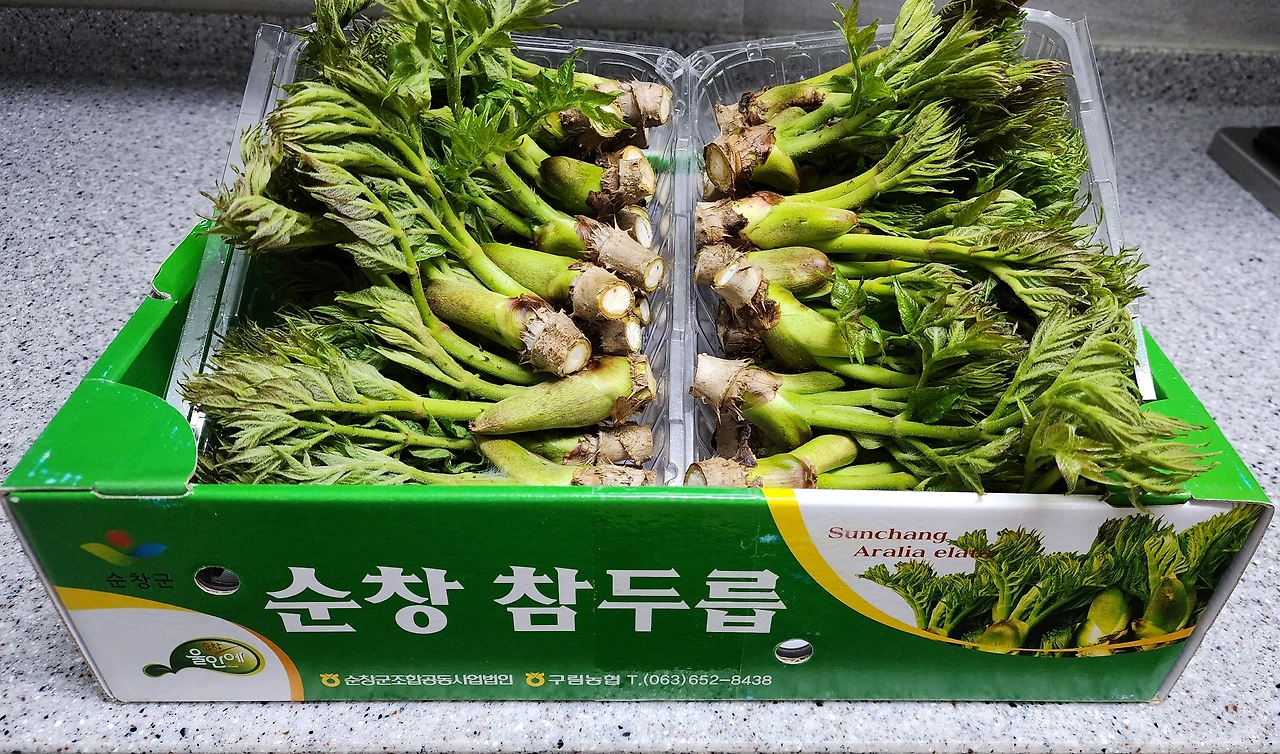 오늘 오리 주물럭을 해 먹을 예정이라 명이나물과 돌나물, 미나리 한 단을 샀다. 명이나물 잎이 제법 커서 오리고기를 명이 나물에 싸서 먹으면 좋을 것 같았다. 집에 도착하니 현관 앞에 택배가 있었다. 남편이 또 뭘 샀나 생각하며 들여놓으려고 보니 순창 참두릅이었다.