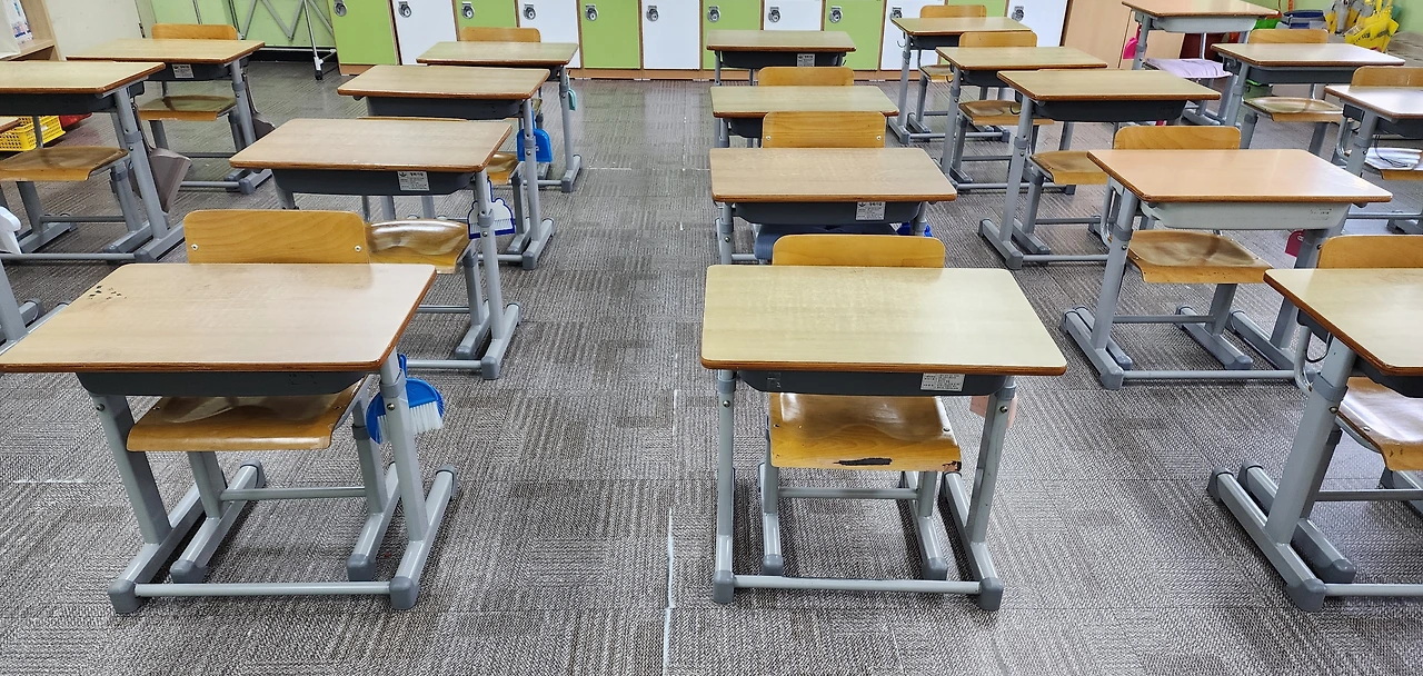 교실은 좁은 공간에서 많은 학생들이 함께 보낸다. 책상도 있고 사물함, 청소함, 책장, 교사용 책상 등 가구들도 있다. 빈 공간이 생각보다 적다. 우리 반은 22명으로 우리 학교에서는 학생수가 많은 축에 속하지만 적당한 인원이라고 생각한다. 코로나 이전에는 책상을 두 개씩 붙여서 공부하였는데 요즈음은 1인용 책상으로 뛰어서 한 줄로 앉는다. 그러다가 모둠 활동이 필요하면 얼른 책상을 돌려 모둠을 만들어 공부한다.
