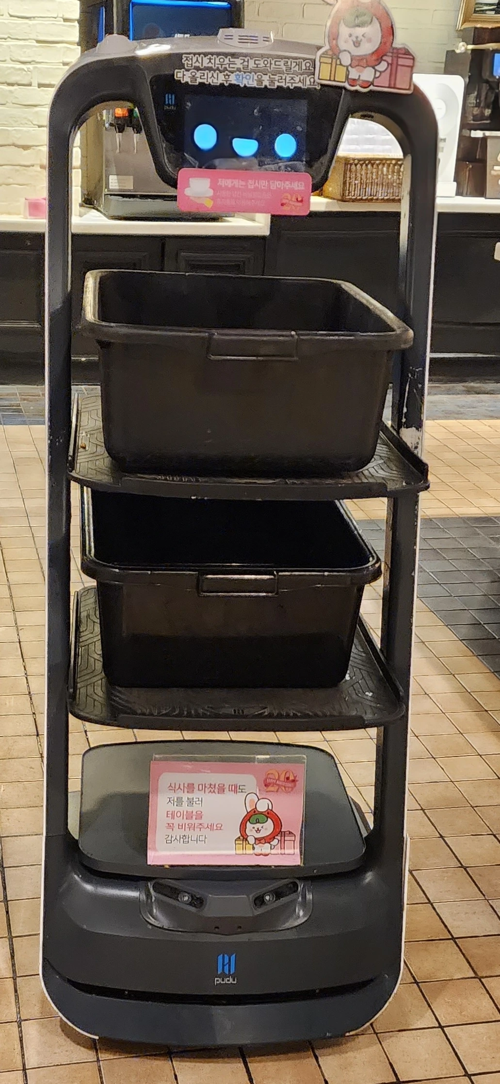 코로나 기간 동안 내부 인테리어를 하였는지 많이 달라졌다. 입구에는 키오스크가 설치되어 있었고 빈 접시 운반은 언택트 로봇이 담당해 주고 있었다. 나가서 식사하려면 키오스크 사용은 이제 필수가 된 것 같다. 더 나이 들기 전에 자꾸 사용해 보아야겠다. 많은 부분을 기계가 대신해 주니 아르바이트 학생들의 일자리가 많이 줄어든 것 같다며 다들 걱정을 하였다.