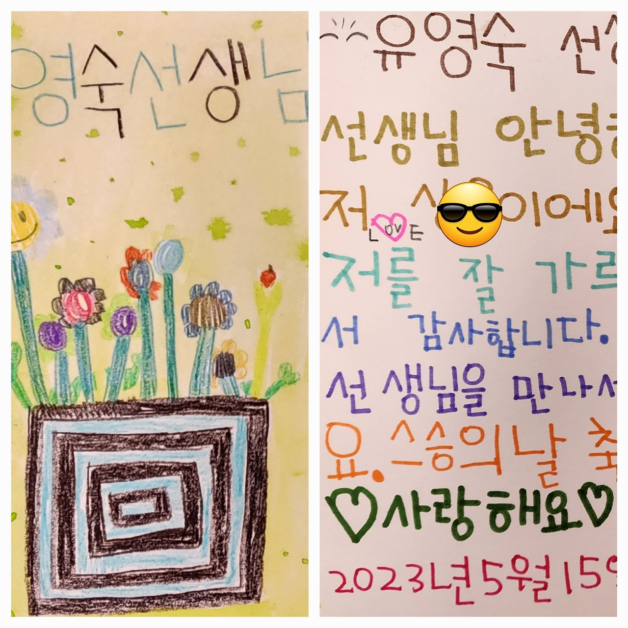 올해 기간제 교사로 나가며 다시 선생님이 되었다. 올해 스승의 날을 보너스로 받았다 스승의 날을 어떻게 보낼까 생각하다가 아침에 오늘이 스승의 날임을 알려주고 스승의 날 노래를 불렀다. 2학년이라 1학년 때 선생님께 편지 쓰기를 하였다. 왼쪽에는 선생님을 그리고 오른쪽에 편지 형식에 맞추어 편지를 썼다.