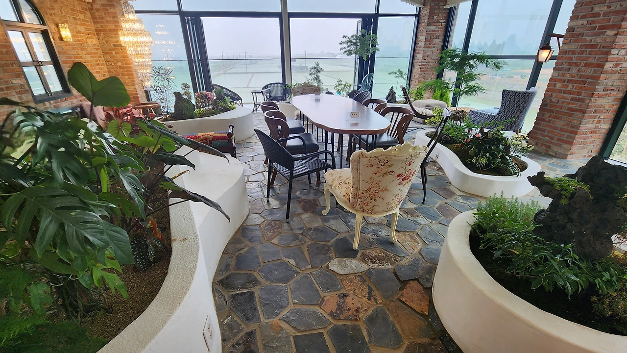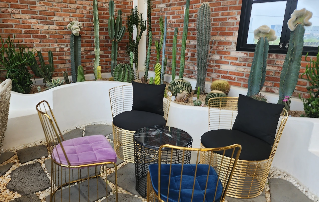 다육 식물 방을 지나 카페로 갔다. 1층에는 작은 연못에 잉어가 헤엄치고 테이블 몇 개가 놓여 있었다. 작지만 참 아름다운 방이었다. 한쪽 옆에는 다양한 선인장류가 자라고 있었다. 이 방을 보면 주인이 돈을 벌려고 차린 것 같지 않다는 말이 나올 만하다. 공간에 테이블이 몇 개 없었다. 그곳을 지나 카페로 올라갔다.
