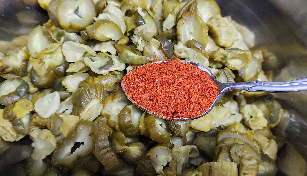 오이지무침에 많은 양념을 넣지 않는다. 고춧가루와 다진 마늘을 넣고 매실청과 들기름만 넣고 무친다. 오이지의 짭조름한 맛이 남아 있어야 맛있기 때문이다.마지막에 깻가루와 통깨를 넉넉하게 넣어주면 완성이다.꿀을 한 스푼 넣어주면 감칠맛이 나는데 오이지가 짜지 않아서 오늘은 넣지 않았다.