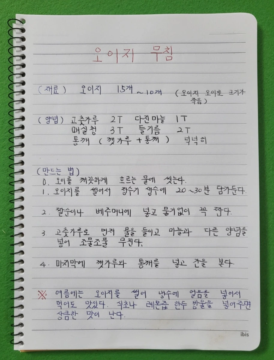 여름 반찬으로 오이지무침만 한 게 없다. 나는 누룽지를 끓여 먹는 것을 좋아하기에 누룽지와 오이지무침도 궁합이 잘 맞는다. 여름에는 여러 가지 반찬을 해 먹기도 어려워서 오이지무침과 멸치조림, 김치 그리고 들기름 발라 구운 김 정도만 있어도 훌륭하다. 가끔 고기를 구워서 상추에 싸서 먹어도 좋고 상추에 깔끔하게 된장만 넣고 쌈 싸 먹는 것도 좋아한다.