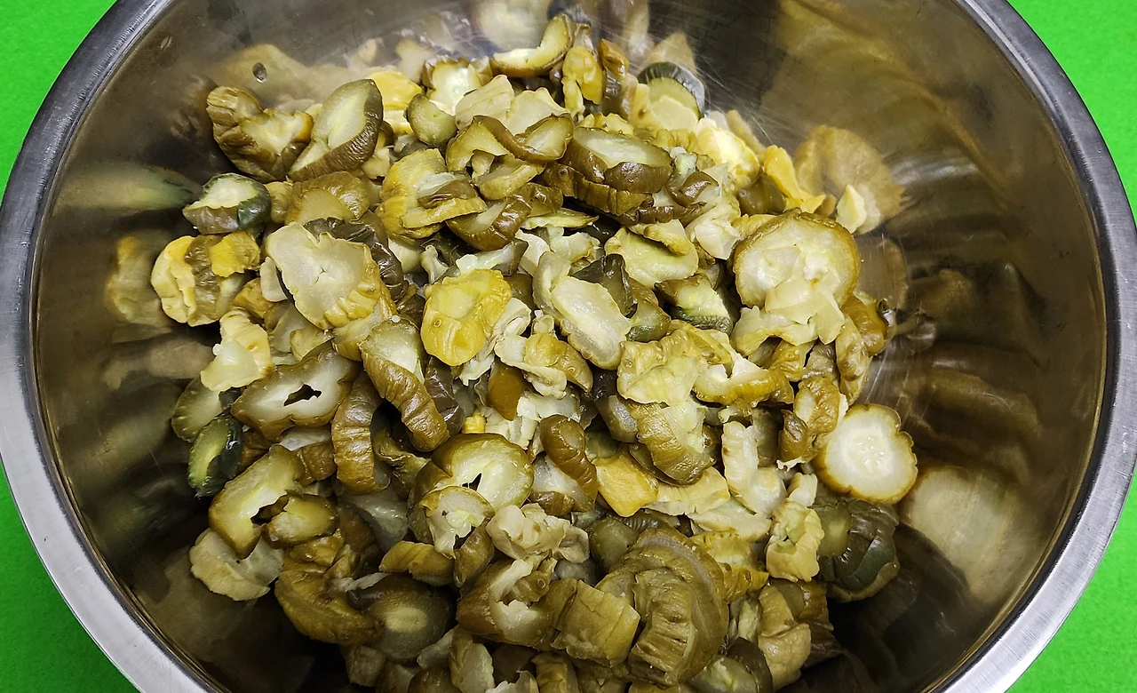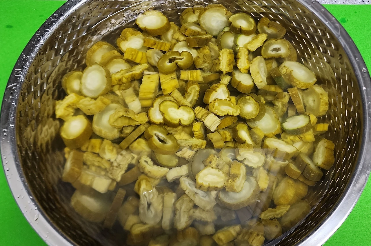오이지 15개를 꺼내서 물에 잘 씻었다. 칼로 썰어서 정수기 냉수에 30분 정도 담가 두었다. 건져서 베 주머니에 넣어서 짜야한다. 오이지무침에서 오이지를 물기 없이 짜는 과정이 가장 힘들다. 주로 남편이 한다. 남편은 정말 물기 없이 꼬들꼬들하게 잘 짜준다. 그러며