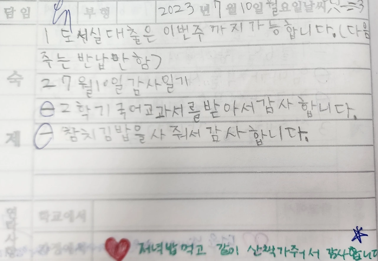 7월 1일부터 알림장에 매일 감사일기를 두 개씩 썼다. 늘 다른 친구를 이르거나 괴롭히는 아이들이 바뀌길 바라는 마음이었다. 1학기를 감사함으로 마무리하고 싶은 마음도 담겼다. 일기라기보다는 감사 문장 두 개다. 학교에서 쓰기도 하고 집에서 써오기도 했다. 몇몇 학부모님께서는 알림장에 사인하시며 학부모님께서도 감사일기를 써 주셨다. 감사했다. 부모님의 사랑을 받은 아이는 학교에서 다른 사람에게 사랑을 나눠줄 줄 안다. 작은 일이지만 감사일기가 앞으로 세상을 살아나가는데 작은 힘이 되길 바란다.