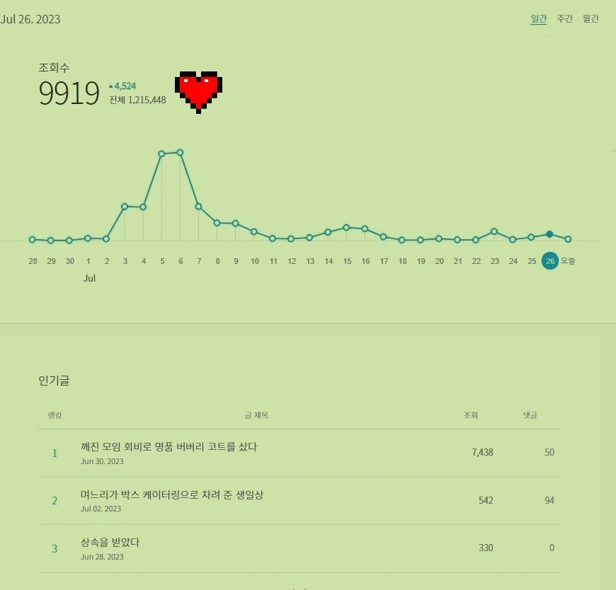 나의 아저씨는 이제 4회만 보면 다 본다. 마지막이 어떻게 끝날지 궁금하다. 나의 해방일기는 해피엔딩으로 끝나서 계속 마음속에 남아서 살아 있다. 나의 글 역주행도 언제 끝이 날지 궁금하다. 일상의 평범한 글인데 많은 분이 읽어주셔서 정말 감사하다. 이제 7월도 스쳐 지나가겠지만 새로운 달 8월에도 좋은 글 쓰며 평온한 일상이길 기도한다. 8월에는 따뜻한 이야기를 뉴스에서 많이 볼 수 있기를 기대해 본다.