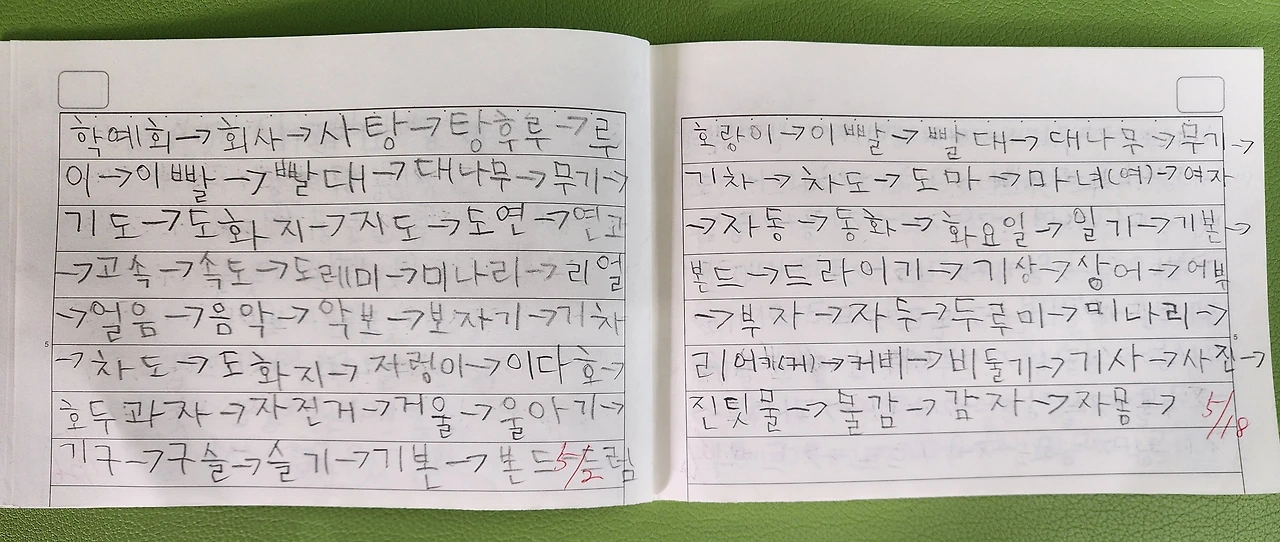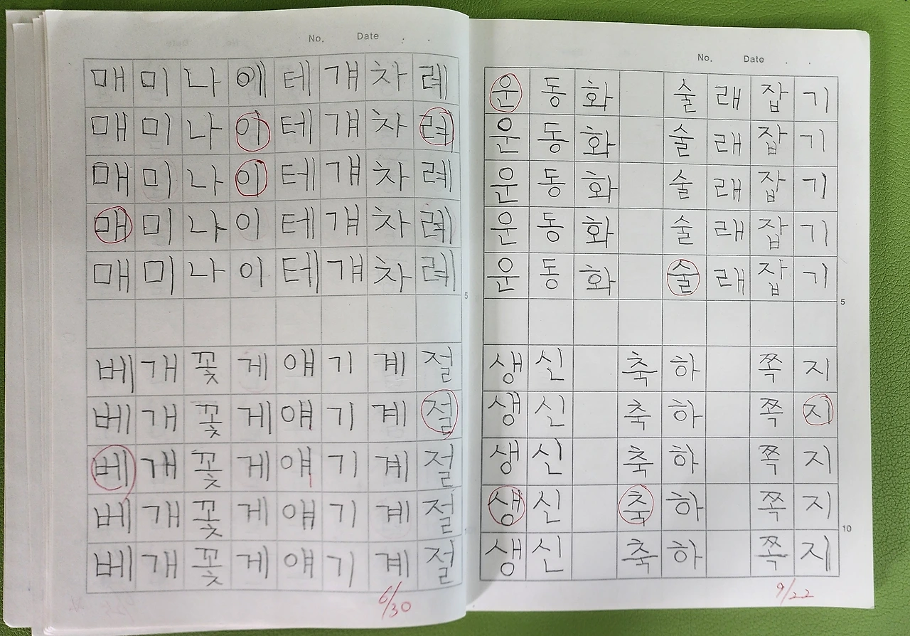 컴퓨터 세대라고는 하지만, 손글씨 쓰기가 필요하다고 생각한다. 2학년인데 1학기부터 글씨를 바르게 쓸 수 있도록 지도하고 있다. 우리 반은 글씨 쓰기 공책으로 8칸 깍두기공책을 사용한다. 받아쓰기 공책은 10칸 깍두기공책을 세로로 사용한다.